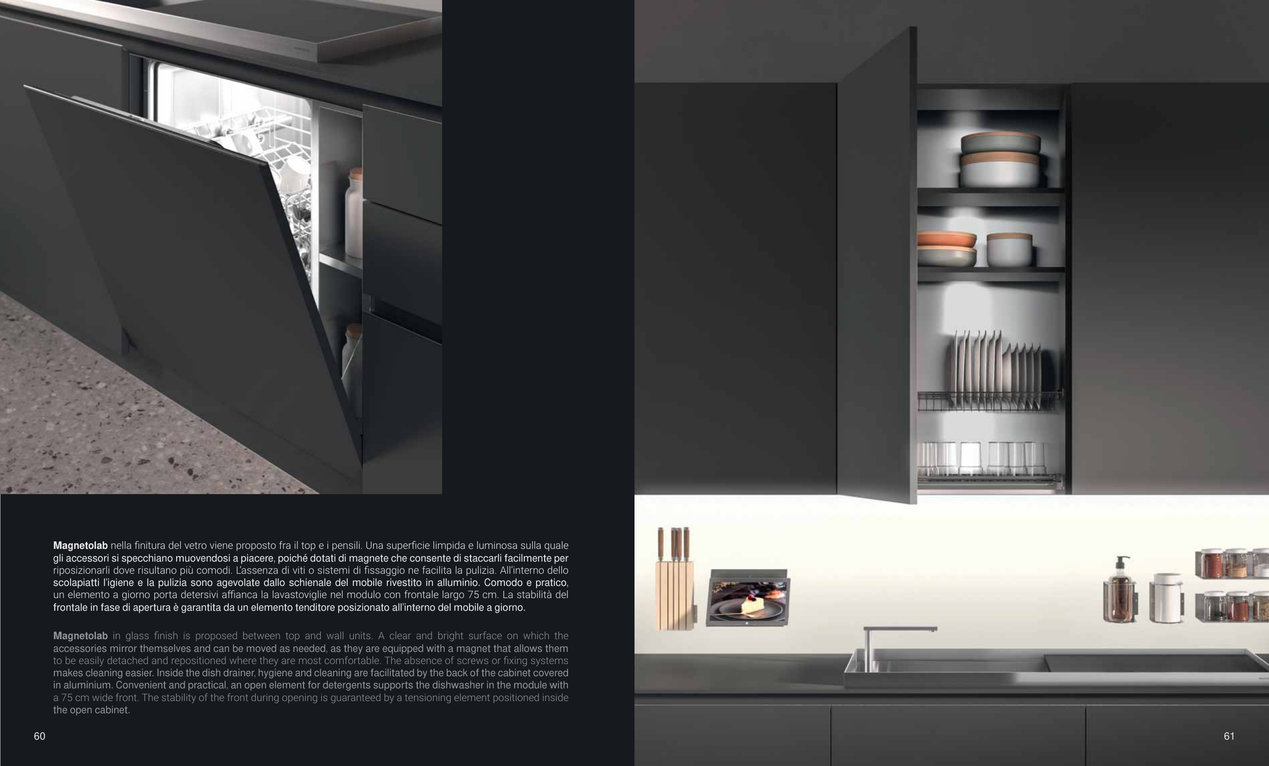 in aluminium. Convenient and practical, an open element for detergents supports the dishwasher in the module with
