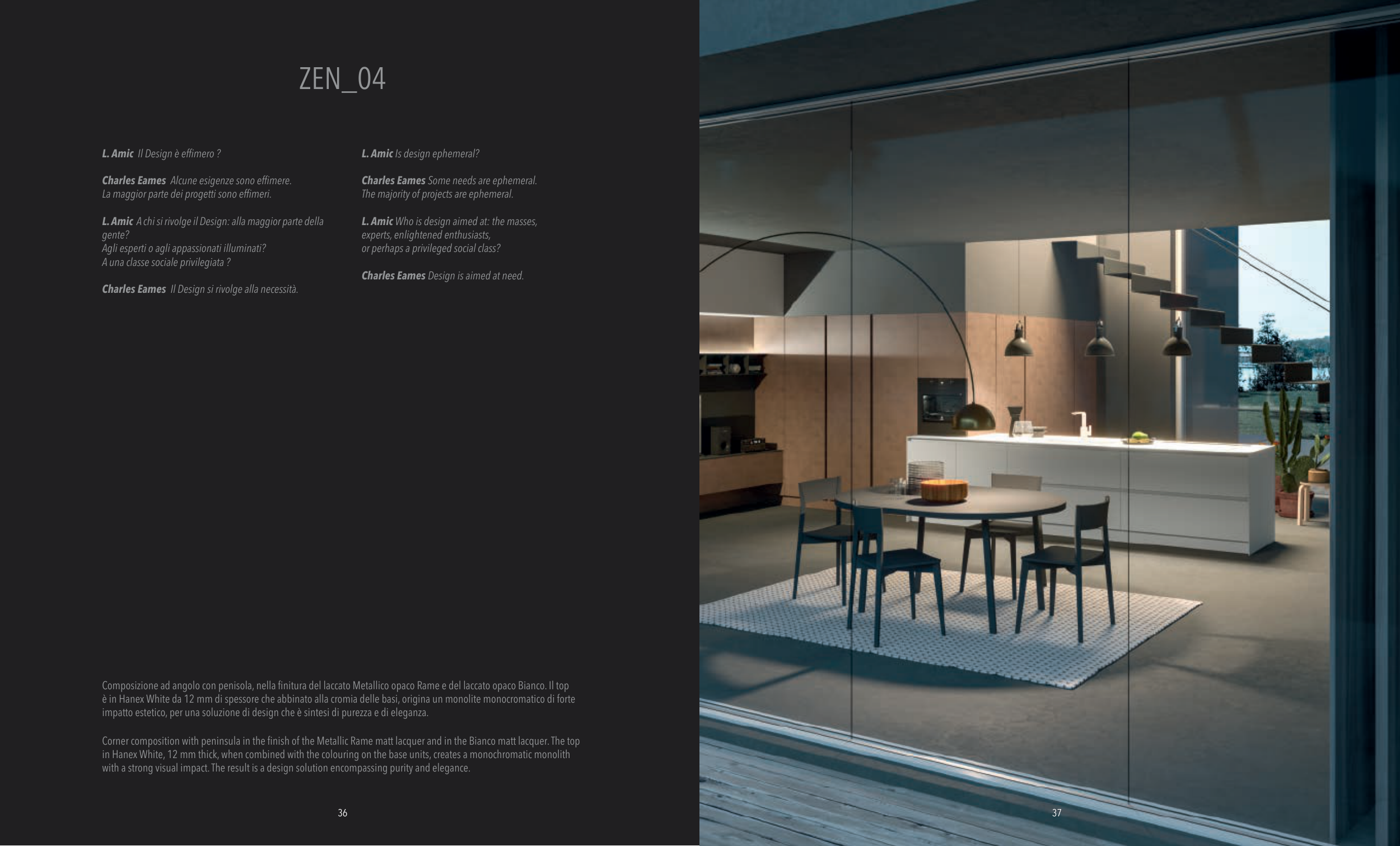 Corner composition with peninsula in the finish of the Metallic Rame matt lacquer and in the Bianco matt lacquer. The top