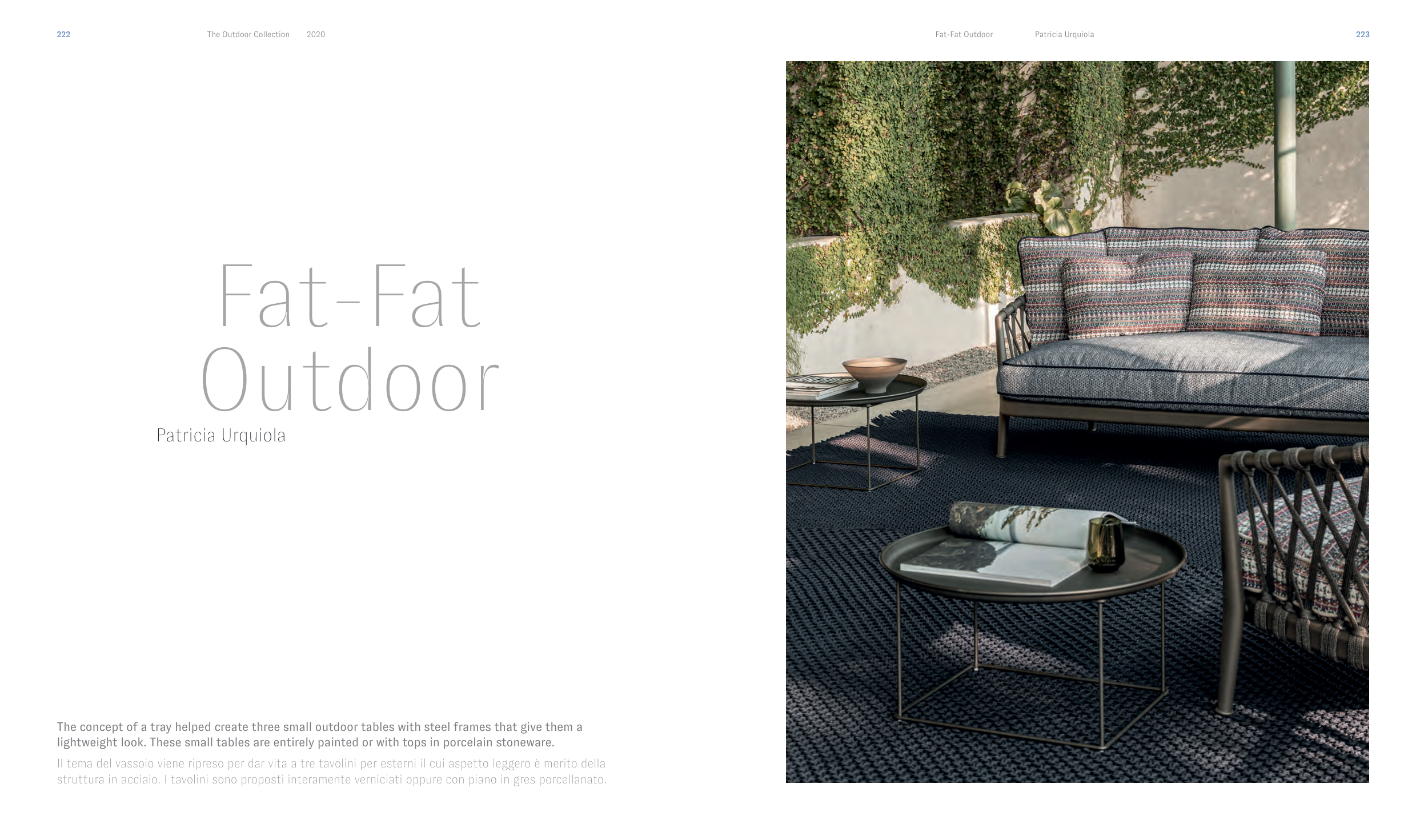 Il tema del vassoio viene ripreso per dar vita a tre tavolini per esterni il cui aspetto leggero è merito della