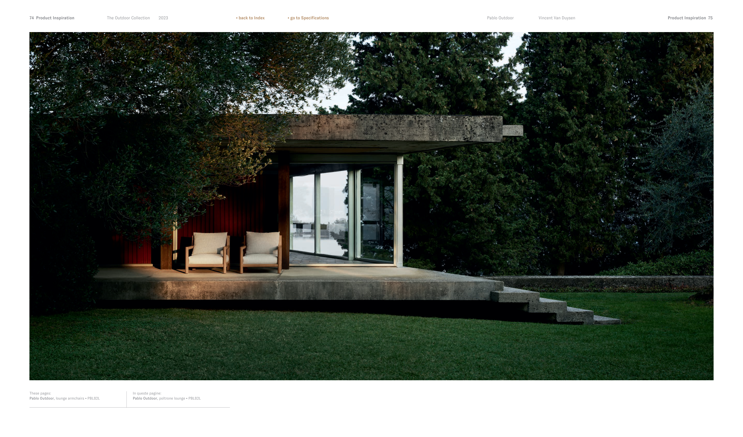 The Outdoor Collection 2023 • back to Index • go to Specifications Product Inspiration 75 74 Product Inspiration Vincent Van Duysen Pablo Outdoor These pages: Pablo Outdoor, lounge armchairs • PBL82L In queste pagine: Pablo Outdoor, poltrone lounge • PBL82L