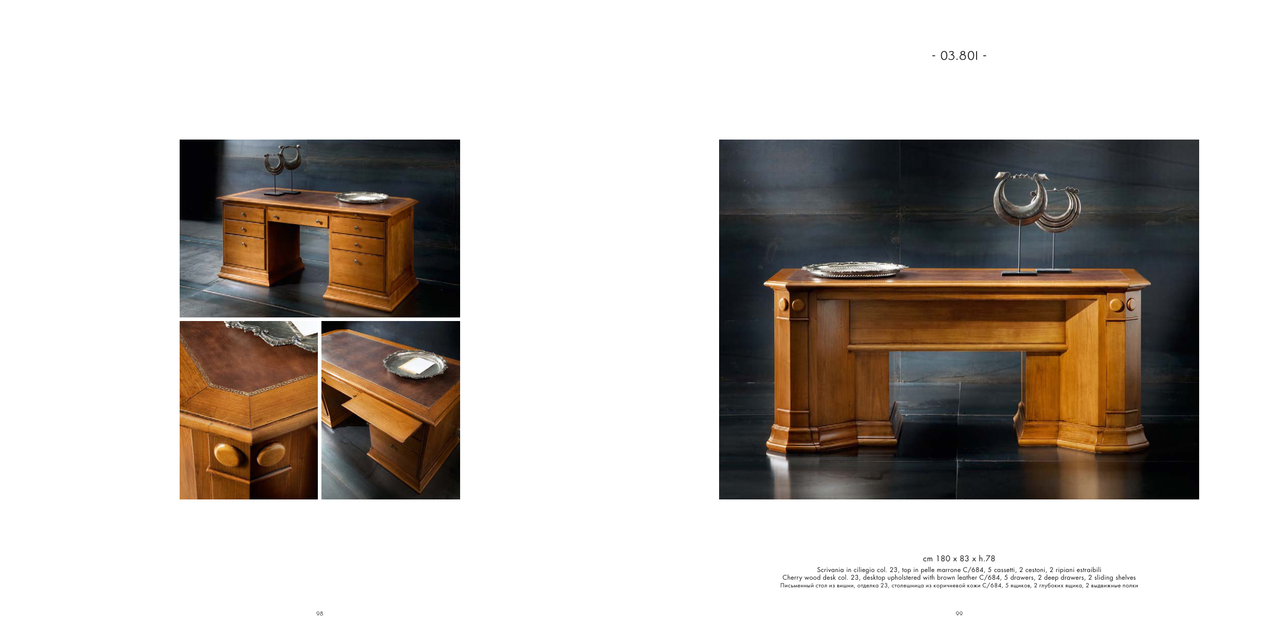 Письменный стол из вишни, отделка 23, столешница из коричневой кожи C/684, 5 ящиков, 2 глубоких ящика, 2 выдвижные полки
