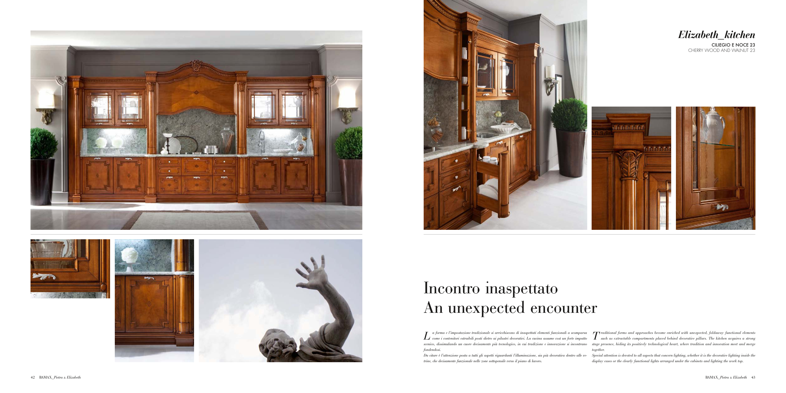 such as extractable compartments placed behind decorative pillars. The kitchen acquires a strong