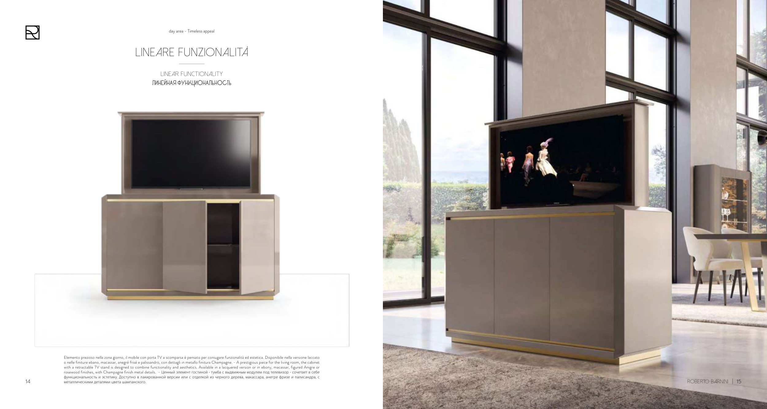 with a retractable TV stand is designed to combine functionality and aesthetics. Available in a lacquered version or in ebony, macassar, figured Anigre or