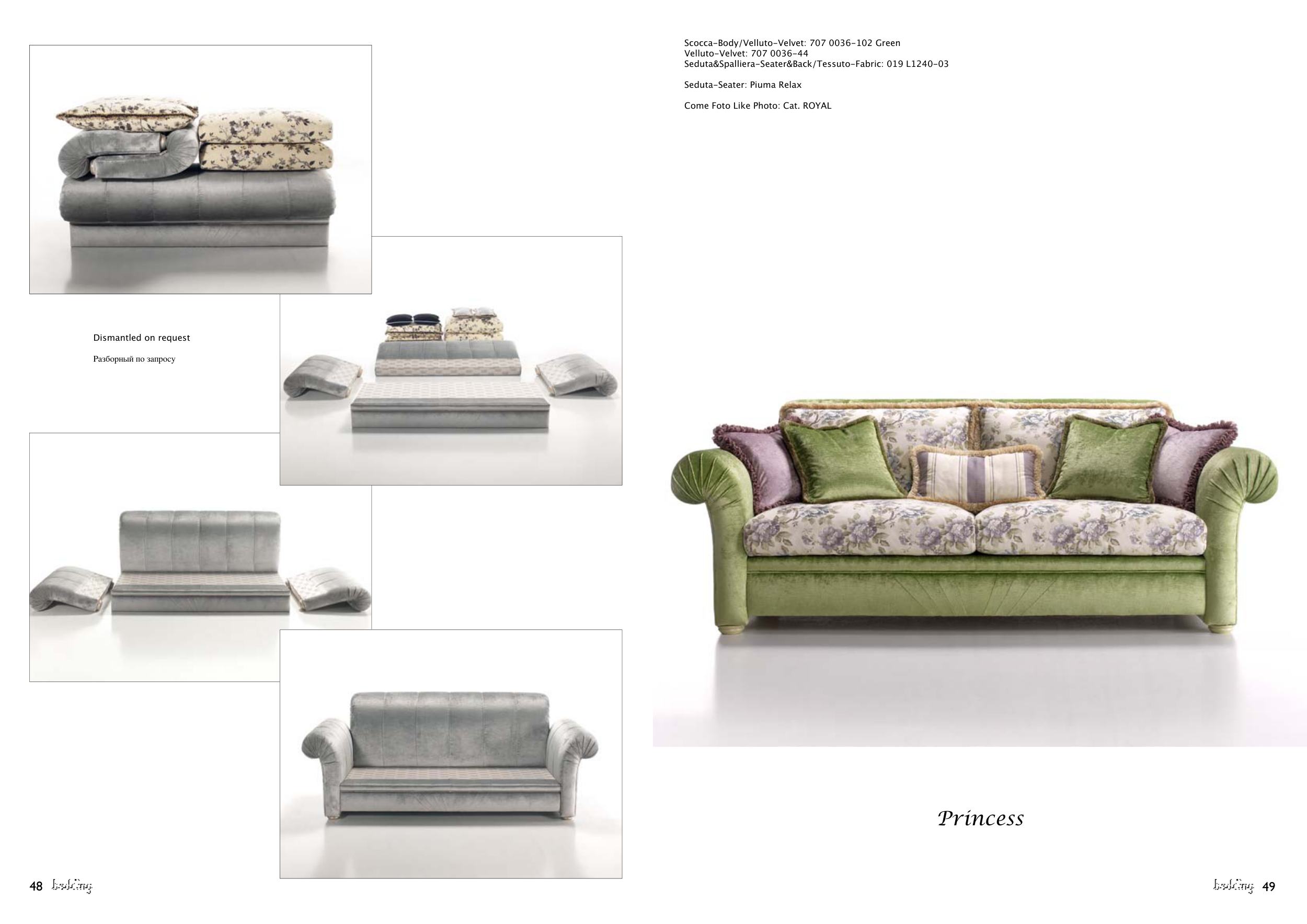 48 49 Scocca-Body/Velluto-Velvet: 707 0036-102 Green Velluto-Velvet: 707 0036-44 Seduta&Spalliera-Seater&Back/Tessuto-Fabric: 019 L1240-03 Seduta-Seater: Piuma Relax Come Foto Like Photo: Cat. ROYAL Princess Dismantled on request Разборный по запросу
