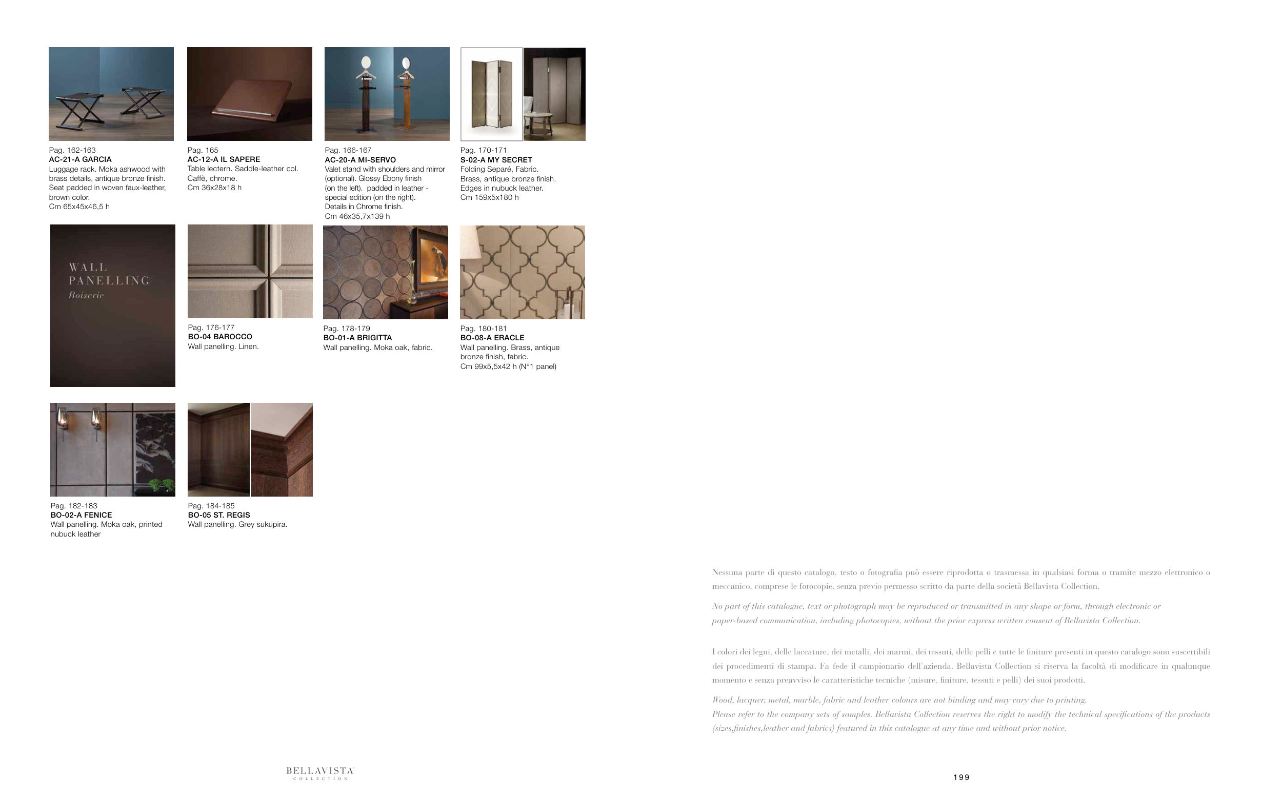 I colori dei legni, delle laccature, dei metalli, dei marmi, dei tessuti, delle pelli e tutte le finiture presenti in questo catalogo sono suscettibili