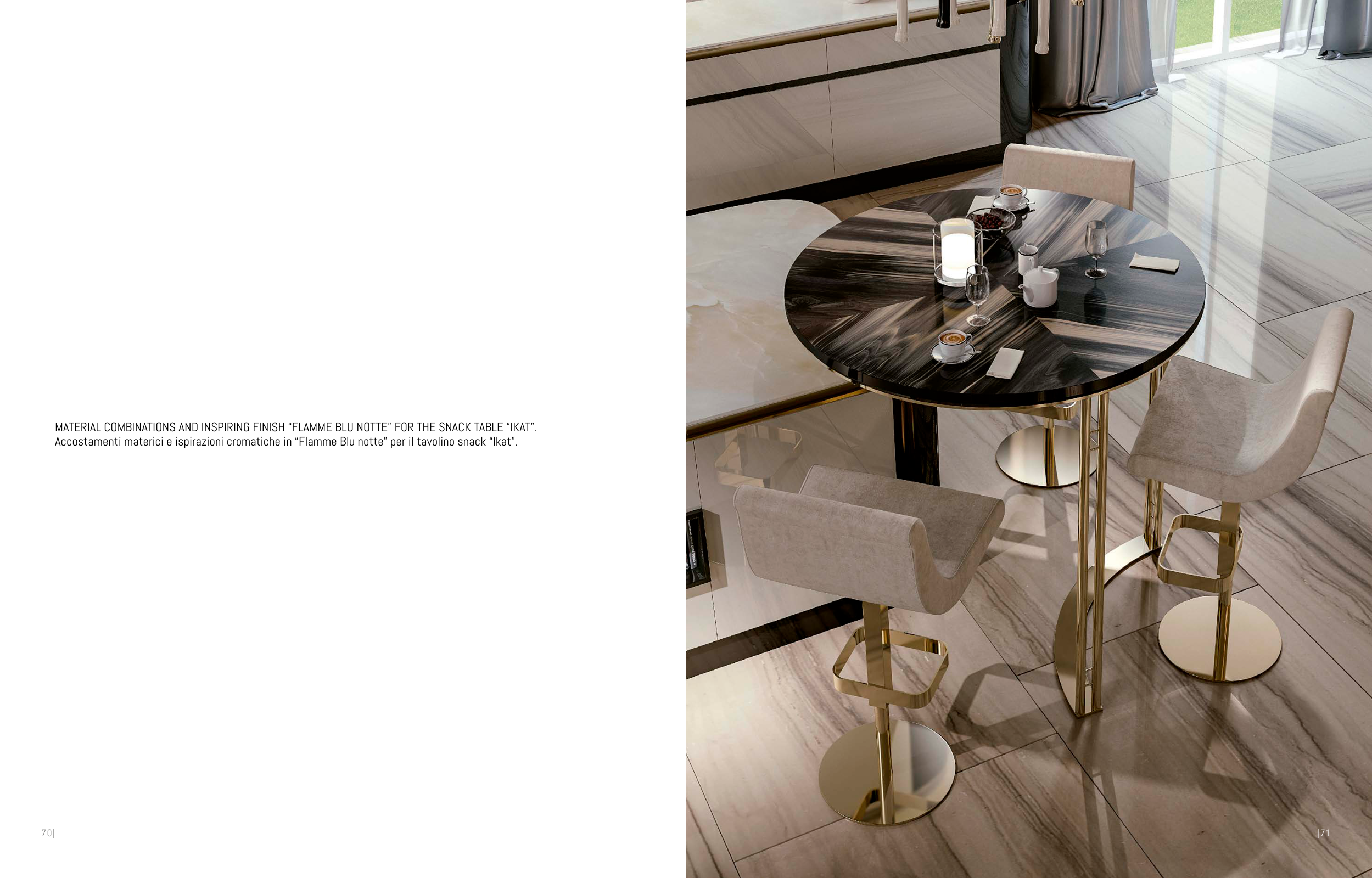 MATERIAL COMBINATIONS AND INSPIRING FINISH “FLAMME BLU NOTTE” FOR THE SNACK TABLE “IKAT”.