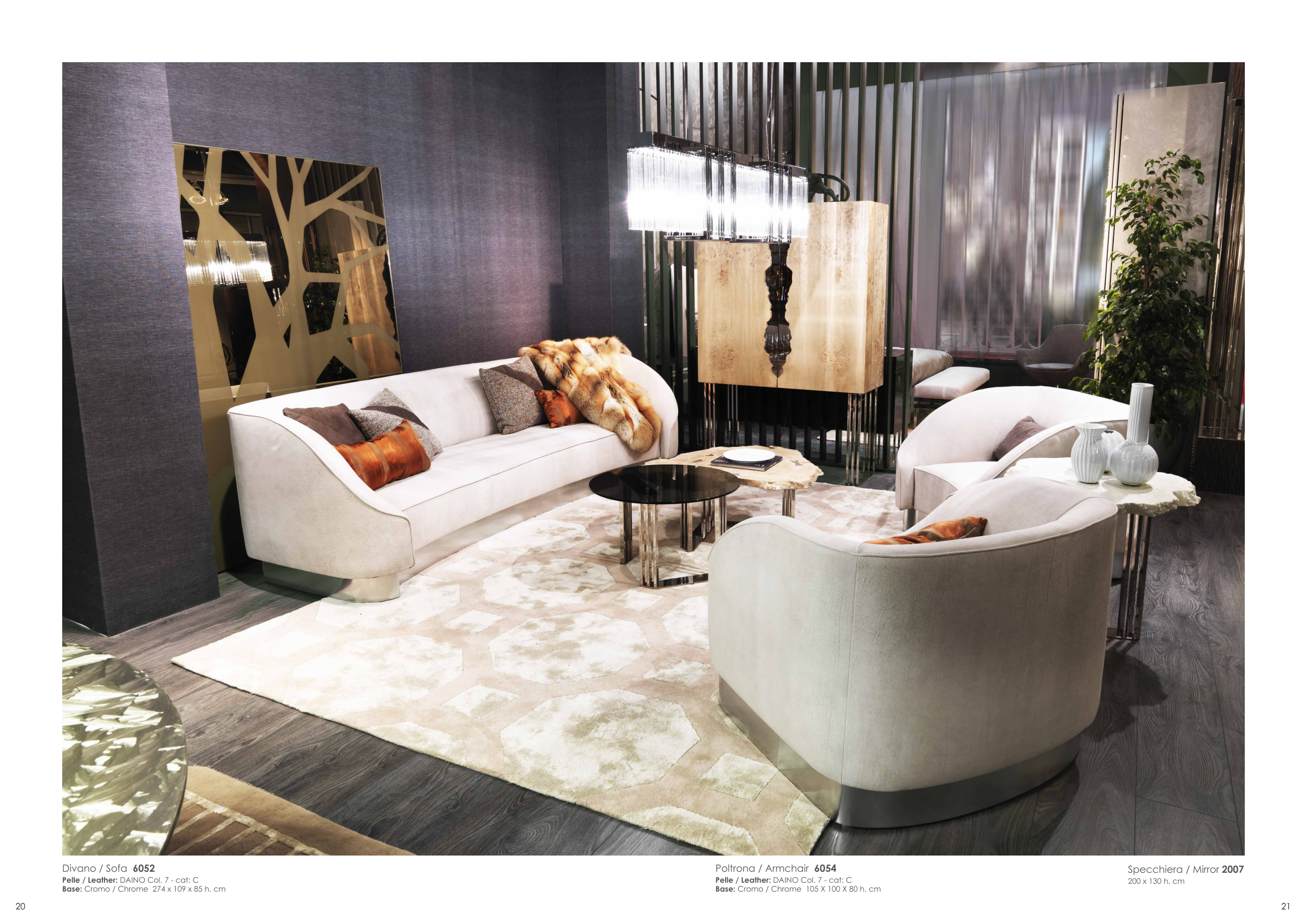 21 20 Divano / Sofa 6052 Pelle / Leather: DAINO Col. 7 - cat: C Base: Cromo / Chrome 274 x 109 x 85 h. cm Specchiera / Mirror 2007 200 x 130 h. cm Poltrona / Armchair 6054 Pelle / Leather: DAINO Col. 7 - cat: C Base: Cromo / Chrome 105 X 100 X 80 h. cm
