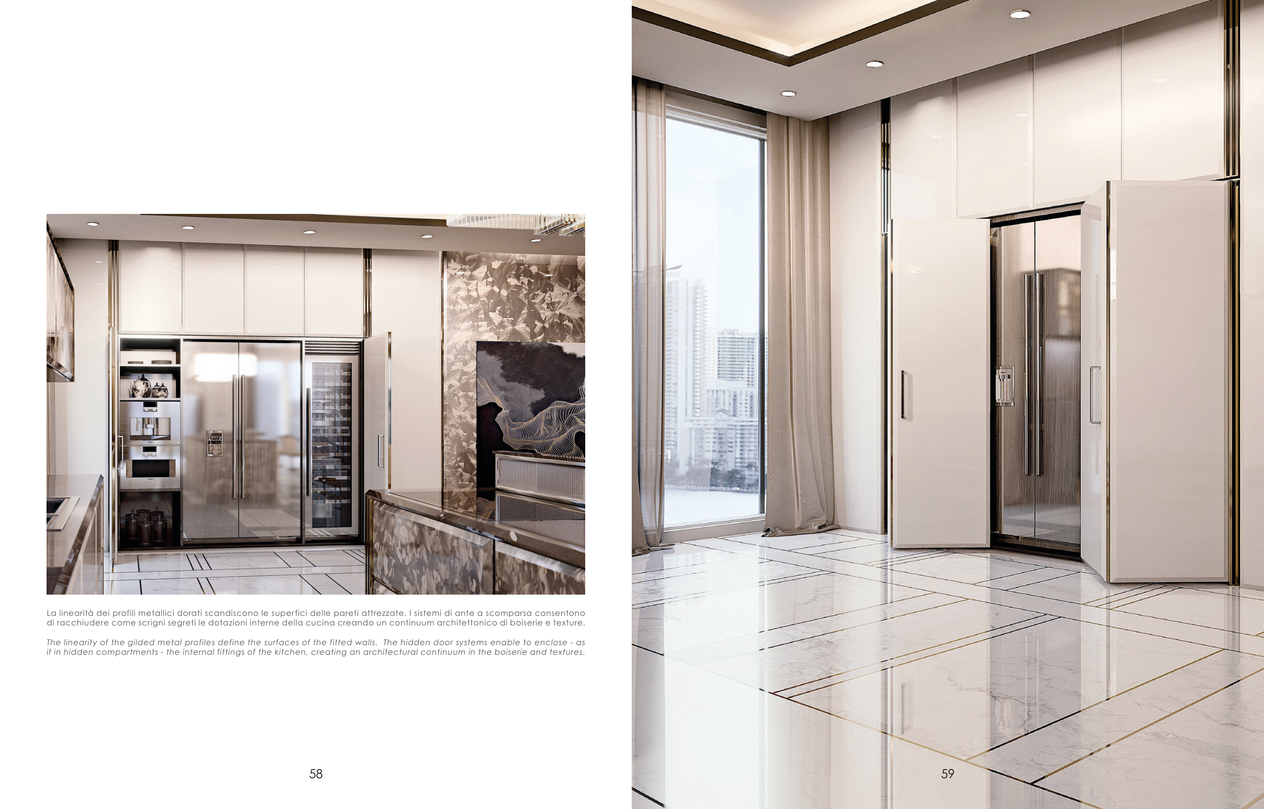 La linearità dei profili metallici dorati scandiscono le superfici delle pareti attrezzate. I sistemi di ante a scomparsa consentono