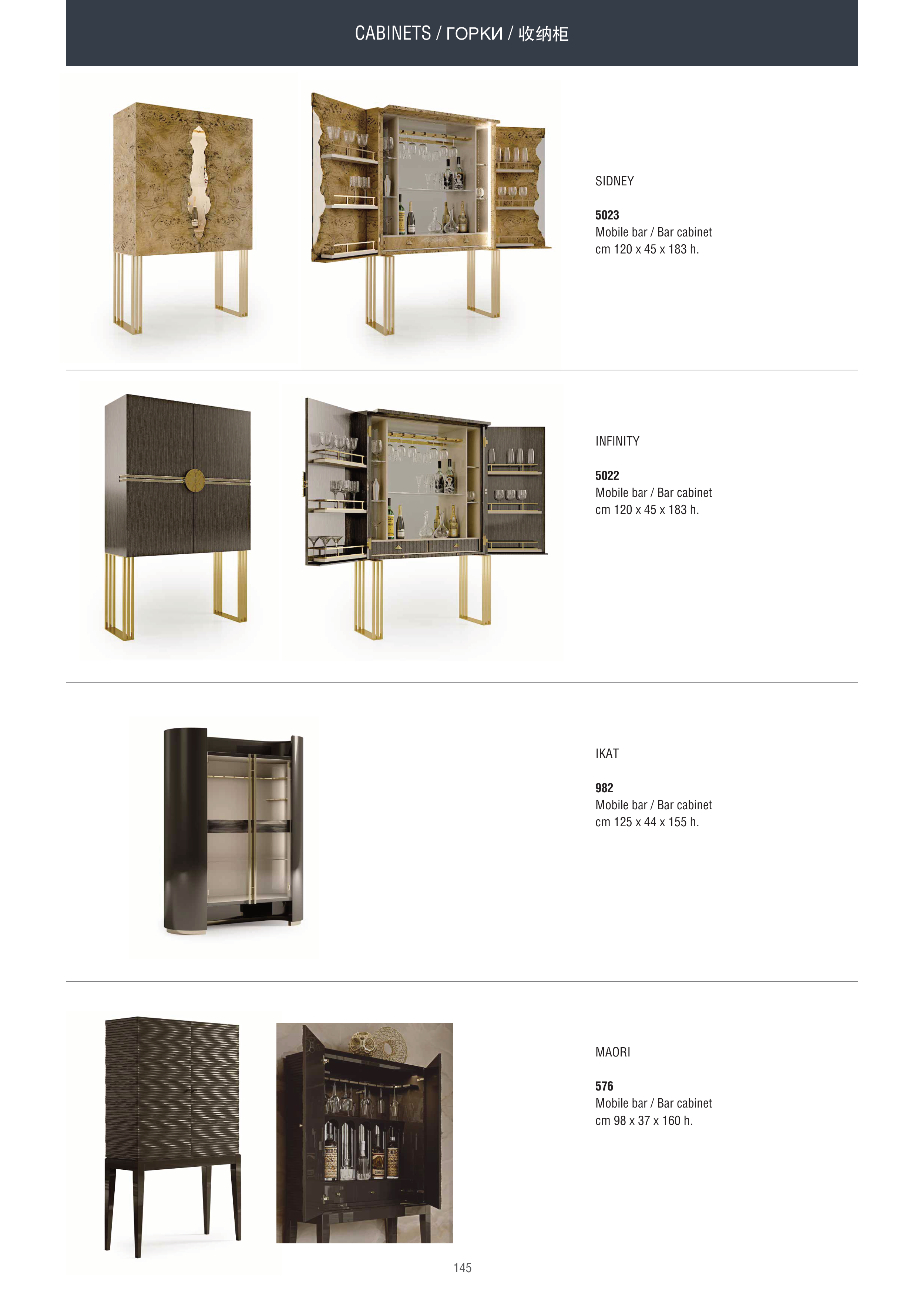 145 CABINETS / ГОРКИ / 收纳柜 INFINITY 5022 Mobile bar / Bar cabinet cm 120 x 45 x 183 h. MAORI 576 Mobile bar / Bar cabinet cm 98 x 37 x 160 h. SIDNEY 5023 Mobile bar / Bar cabinet cm 120 x 45 x 183 h. IKAT 982 Mobile bar / Bar cabinet cm 125 x 44 x 155 h.
