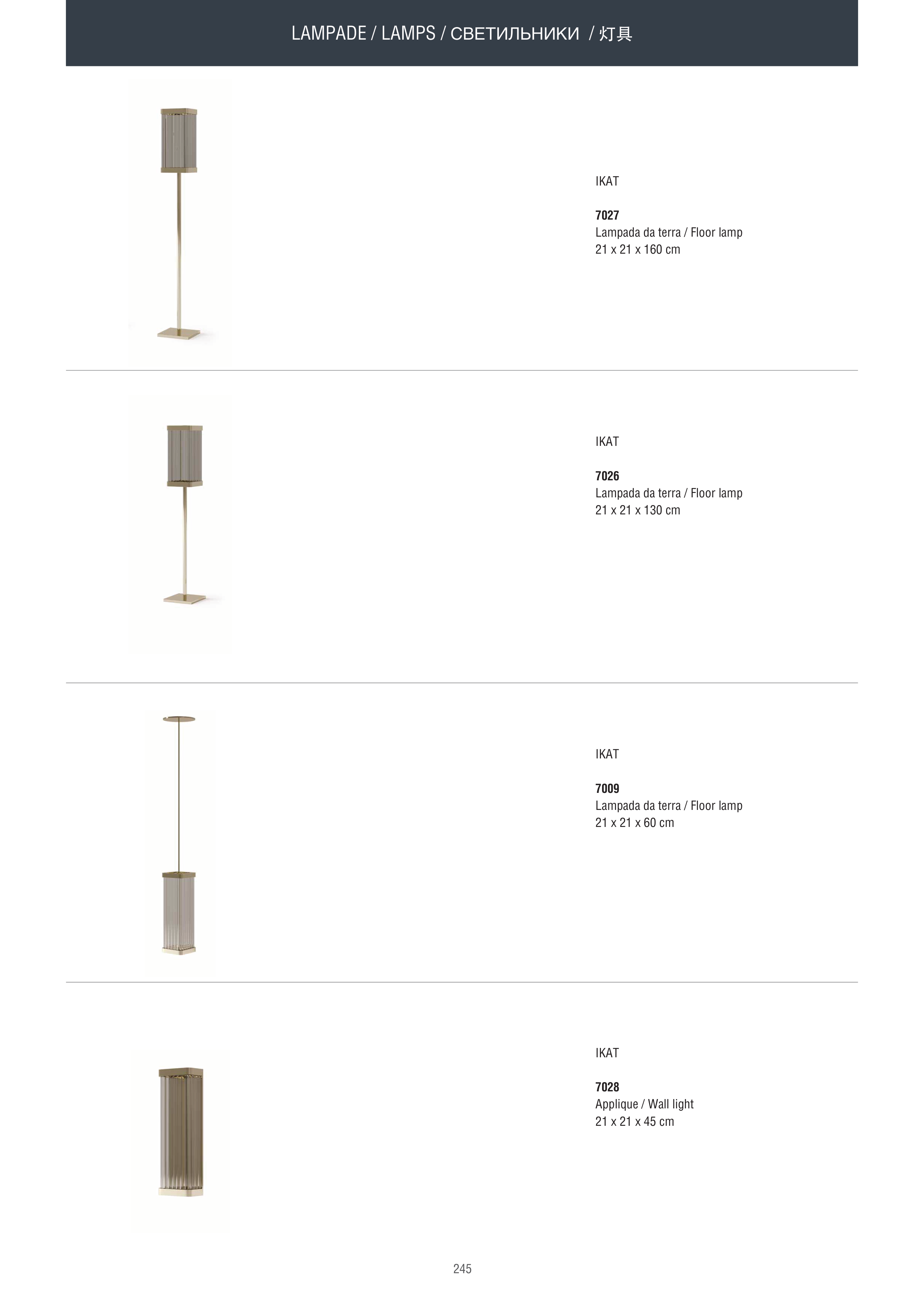245 IKAT 7027 Lampada da terra / Floor lamp 21 x 21 x 160 cm IKAT 7026 Lampada da terra / Floor lamp 21 x 21 x 130 cm IKAT 7028 Applique / Wall light 21 x 21 x 45 cm IKAT 7009 Lampada da terra / Floor lamp 21 x 21 x 60 cm LAMPADE / LAMPS / СВЕТИЛЬНИКИ / 灯具