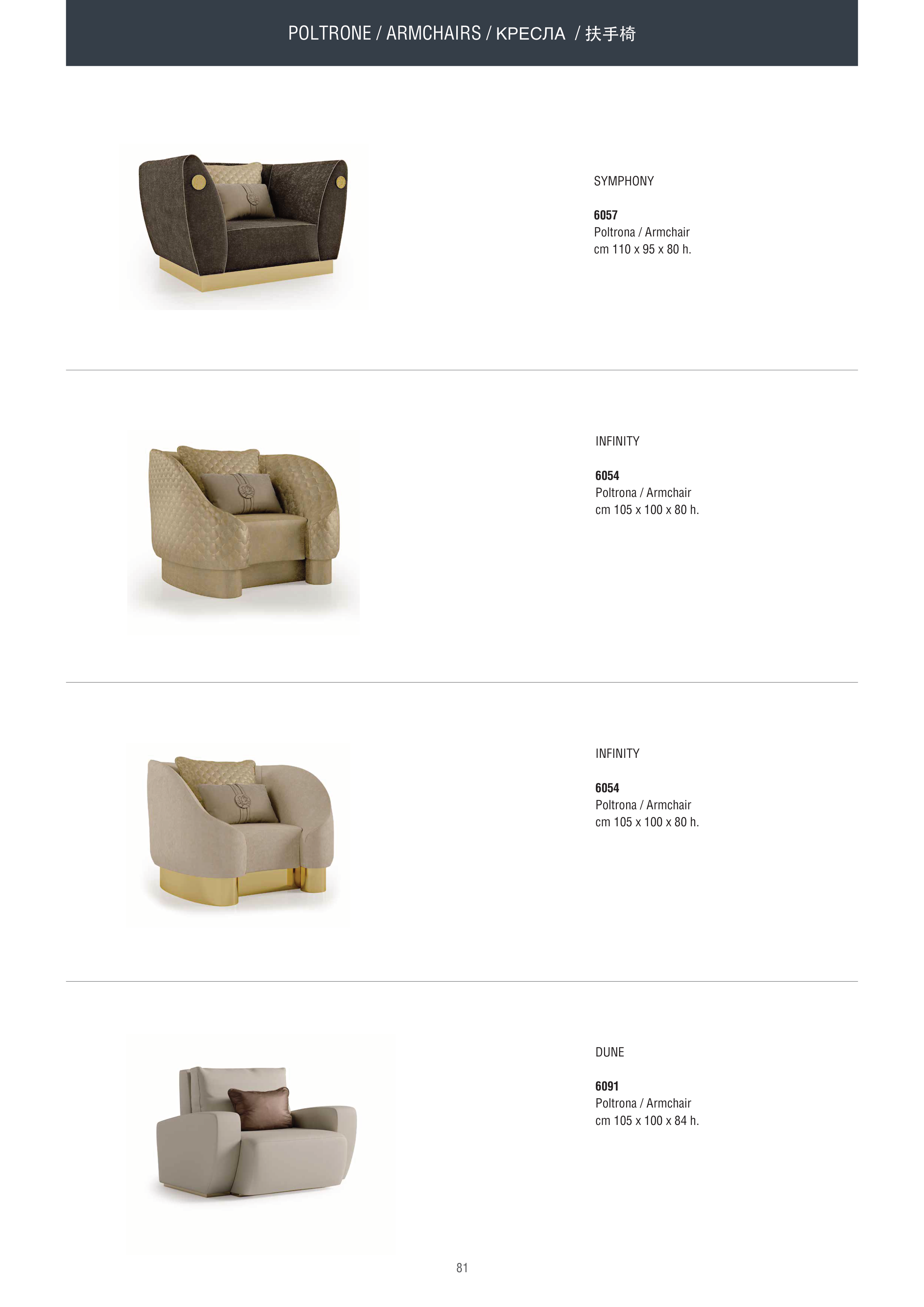 81 POLTRONE / ARMCHAIRS / КРЕСЛА / 扶手椅 SYMPHONY 6057 Poltrona / Armchair cm 110 x 95 x 80 h. INFINITY 6054 Poltrona / Armchair cm 105 x 100 x 80 h. INFINITY 6054 Poltrona / Armchair cm 105 x 100 x 80 h. DUNE 6091 Poltrona / Armchair cm 105 x 100 x 84 h.