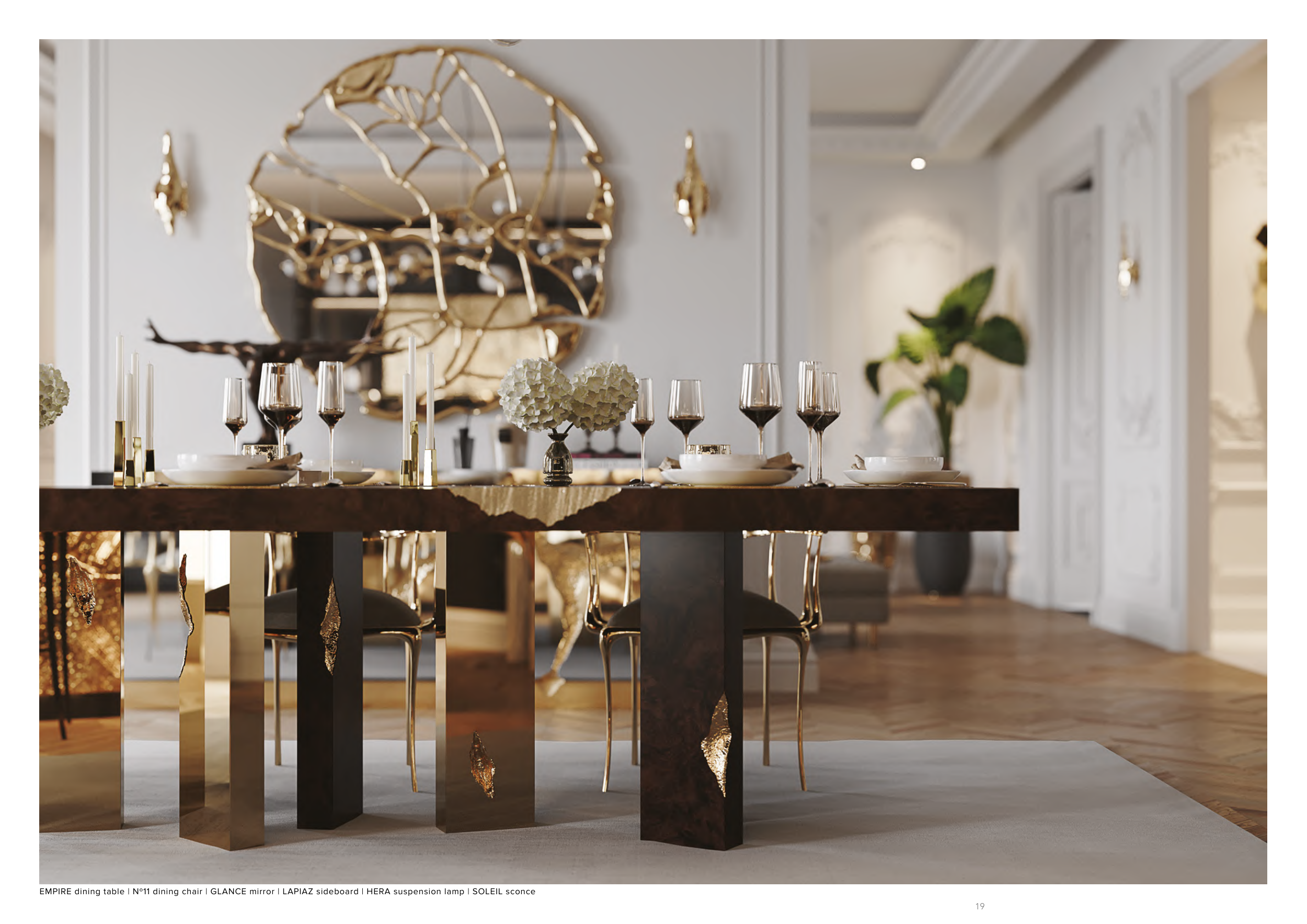 EMPIRE dining table | Nº11 dining chair | GLANCE mirror | LAPIAZ sideboard | HERA suspension lamp | SOLEIL sconce