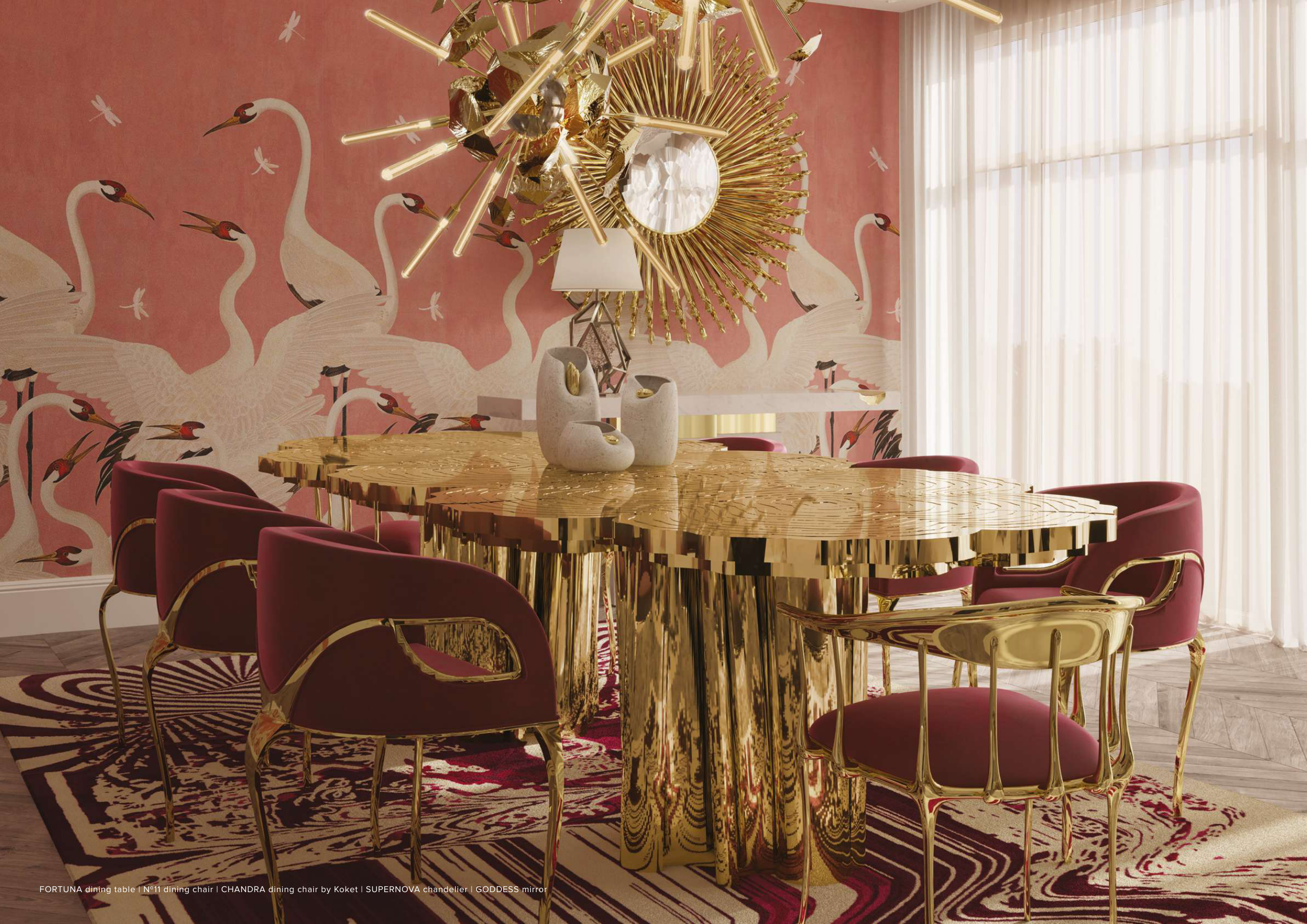 FORTUNA dining table | Nº11 dining chair | CHANDRA dining chair by Koket | SUPERNOVA chandelier | GODDESS mirror