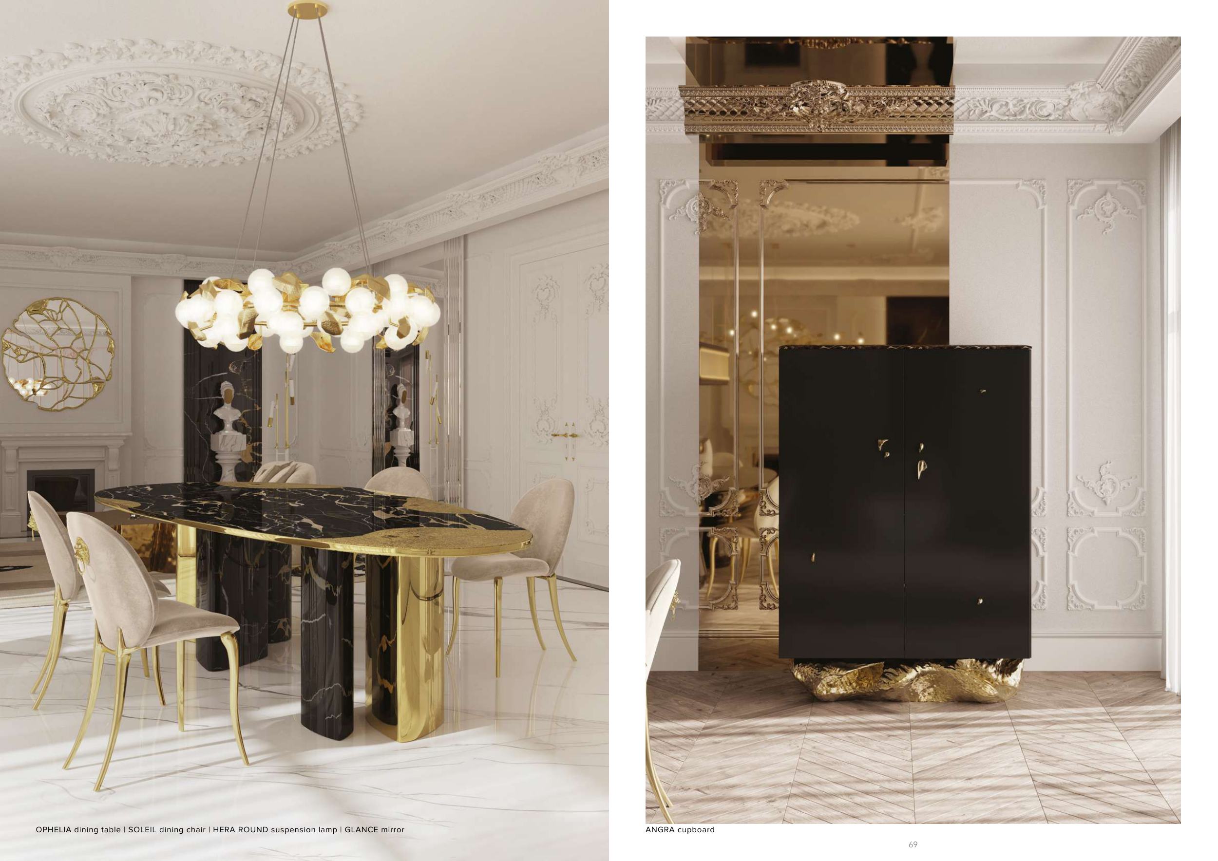 OPHELIA dining table | SOLEIL dining chair | HERA ROUND suspension lamp | GLANCE mirror