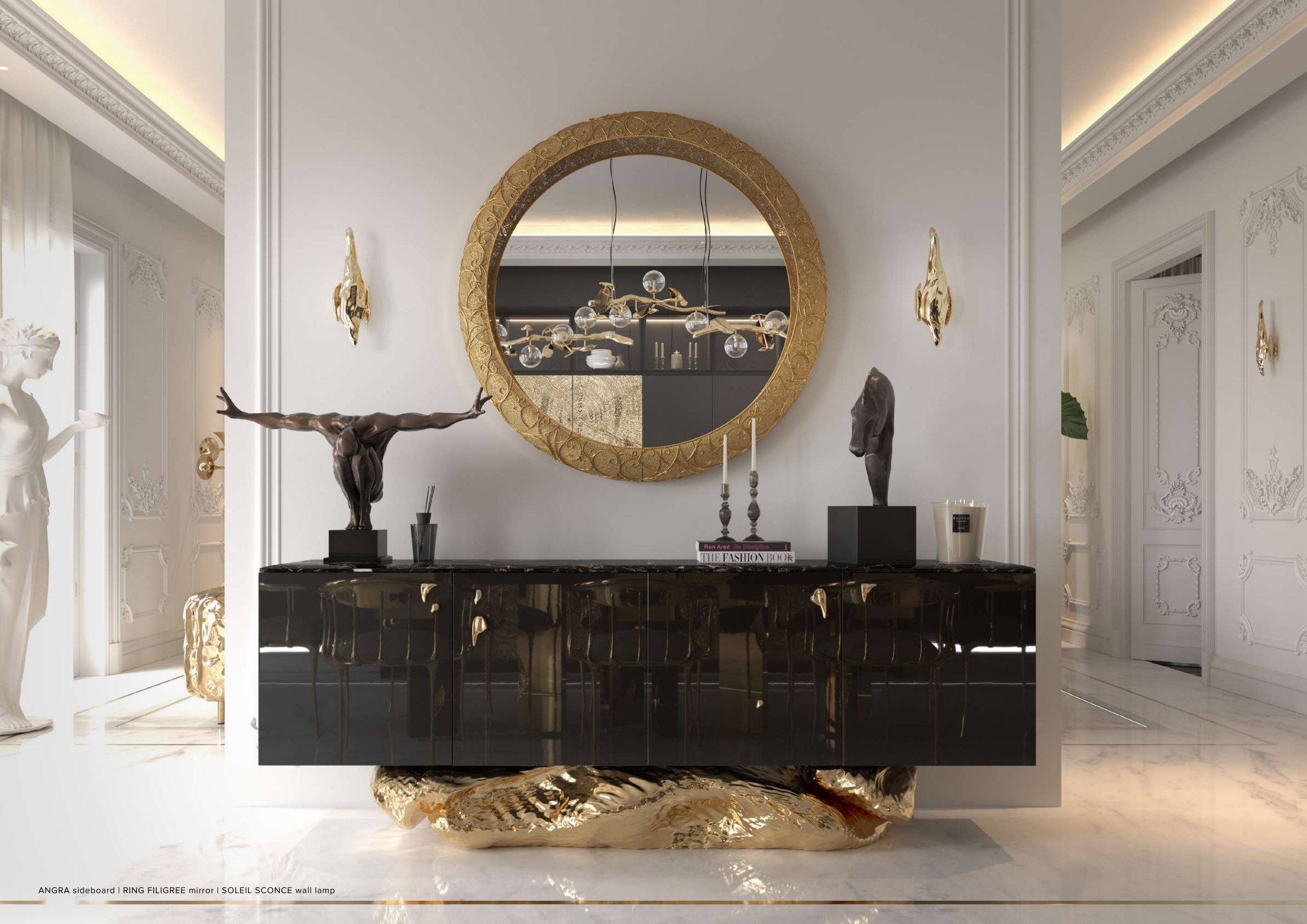 ANGRA sideboard | RING FILIGREE mirror | SOLEIL SCONCE wall lamp