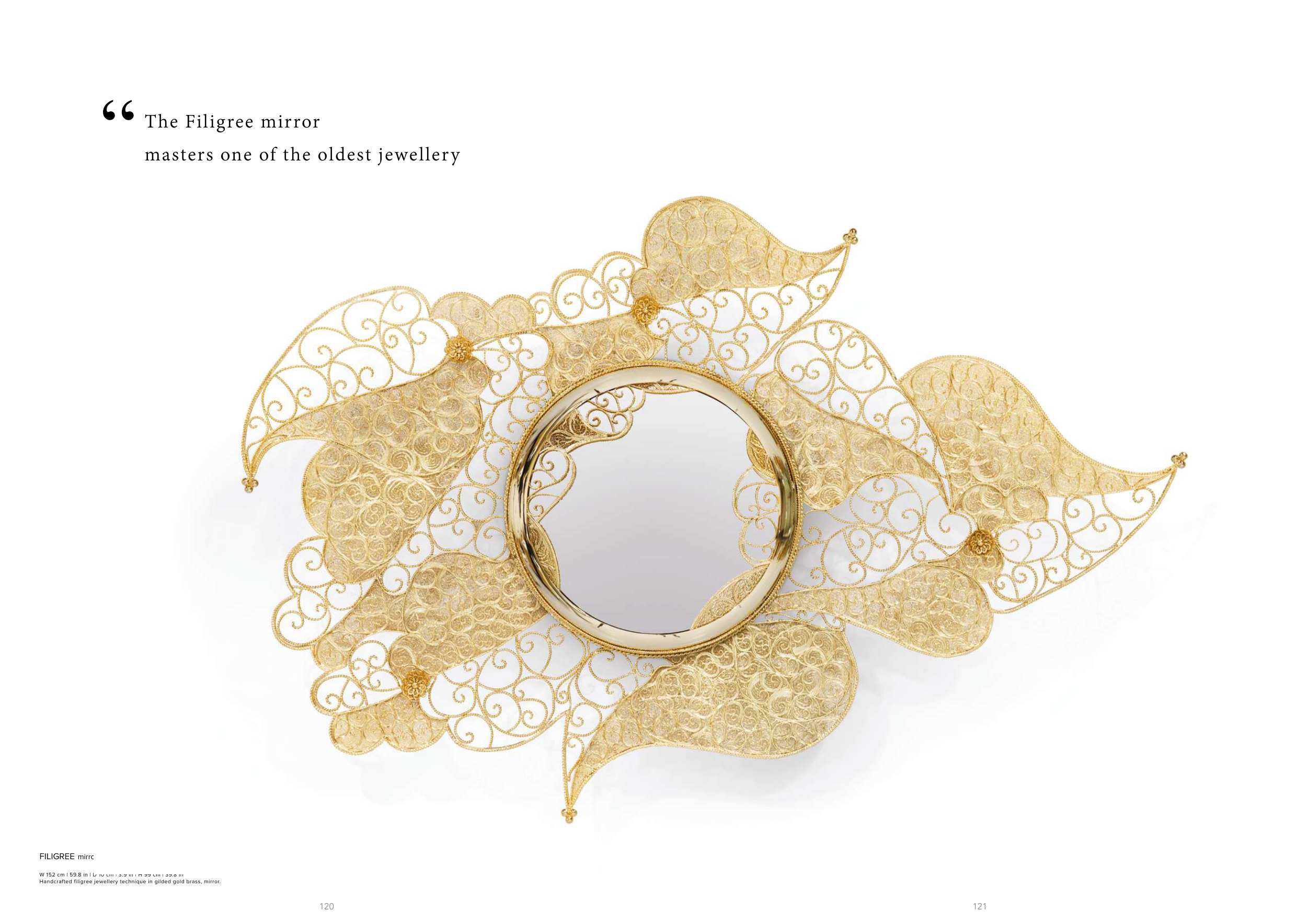 120 121 The Filigree mirror masters one of the oldest jewellery techniques into an upscale piece of art. “ FILIGREE mirror W 152 cm | 59.8 in | D 10 cm | 3.9 in | H 99 cm | 39.8 in Handcrafted filigree jewellery technique in gilded gold brass, mirror.