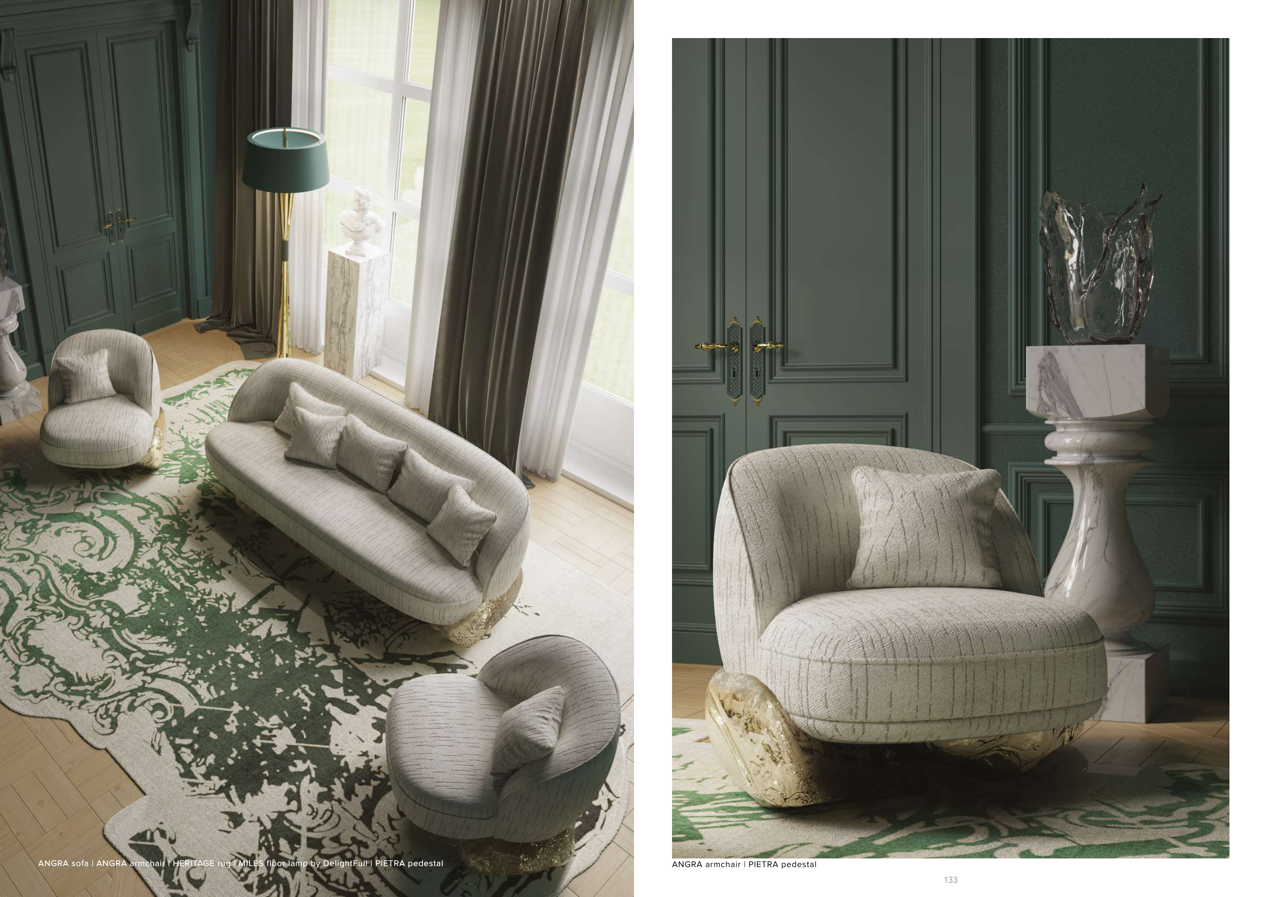 ANGRA sofa | ANGRA armchair | HERITAGE rug | MILES floor lamp by DelightFull | PIETRA pedestal