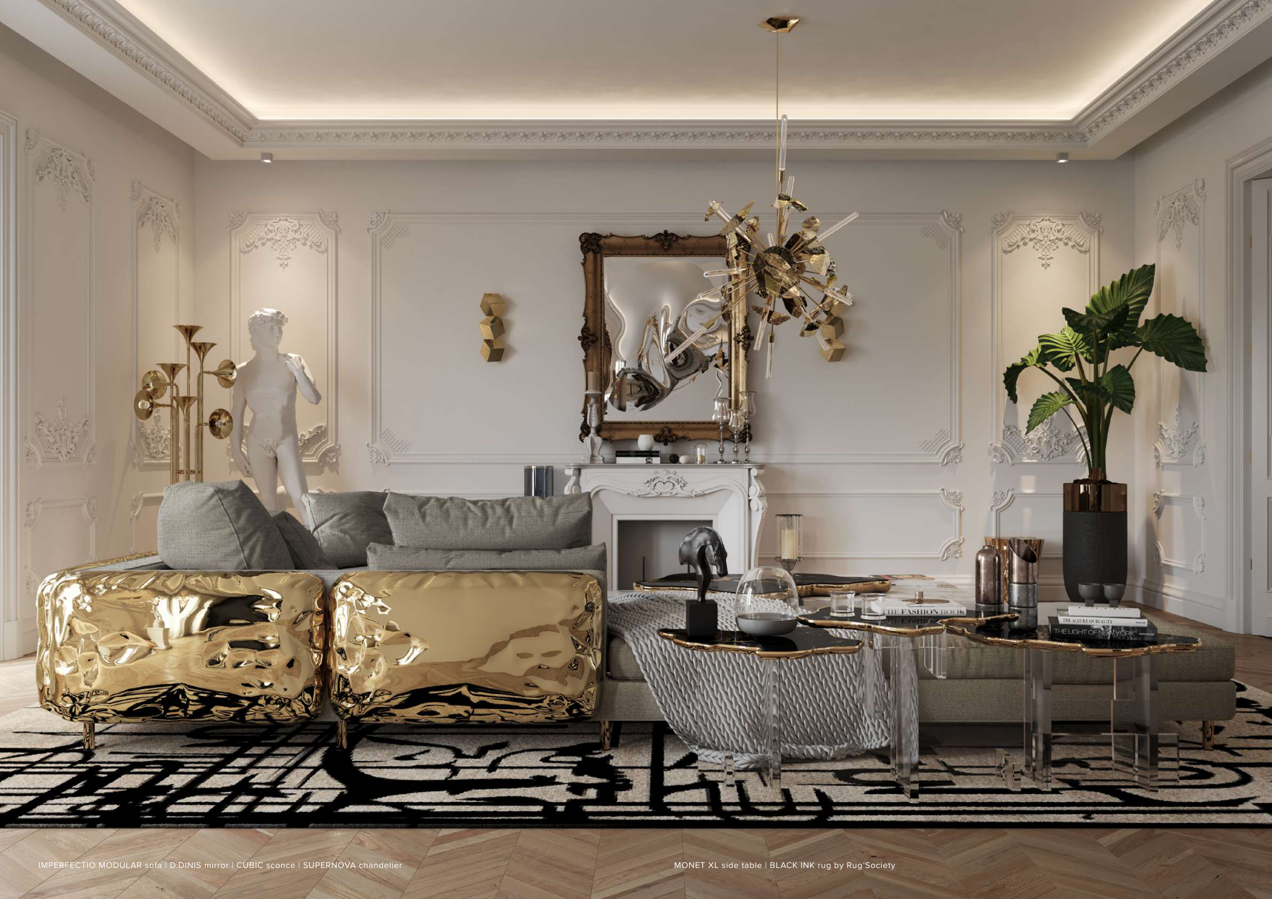 IMPERFECTIO MODULAR sofa | D.DINIS mirror | CUBIC sconce | SUPERNOVA chandelier