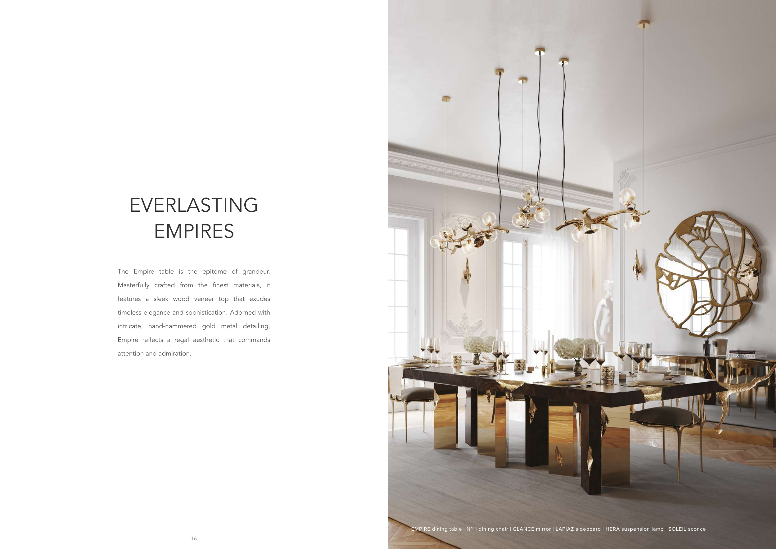EMPIRE dining table | Nº11 dining chair | GLANCE mirror | LAPIAZ sideboard | HERA suspension lamp | SOLEIL sconce