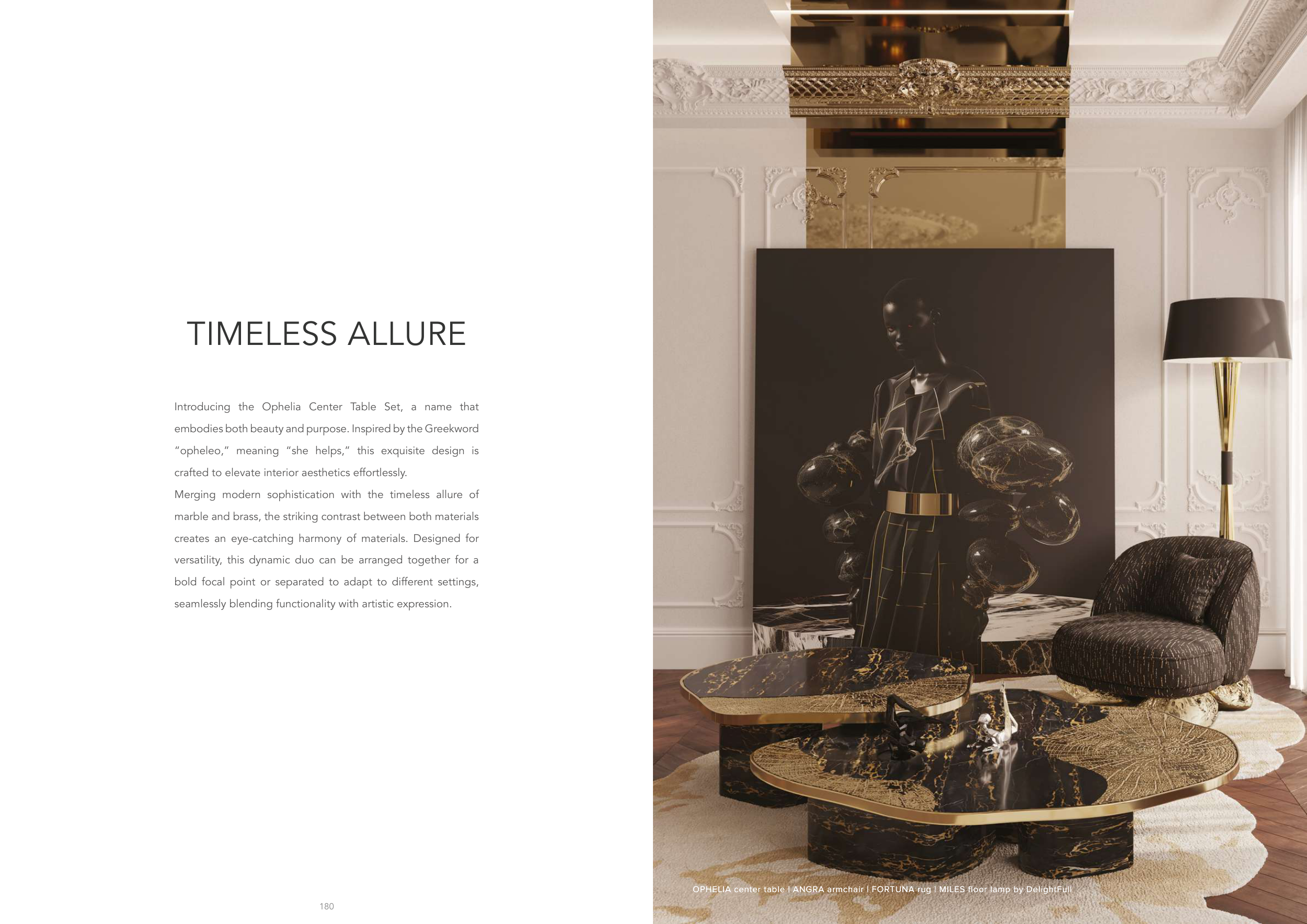 OPHELIA center table | ANGRA armchair | FORTUNA rug | MILES floor lamp by DelightFull