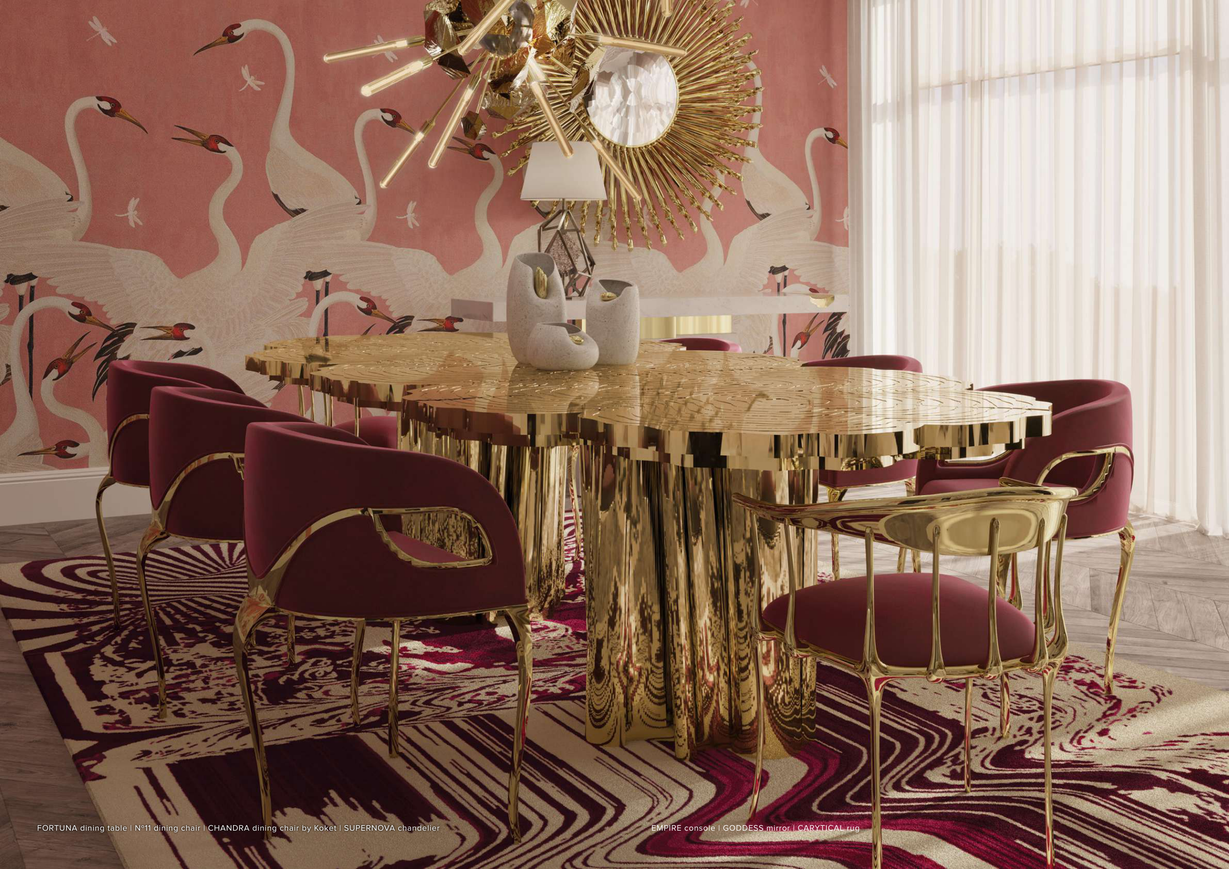 FORTUNA dining table | Nº11 dining chair | CHANDRA dining chair by Koket | SUPERNOVA chandelier