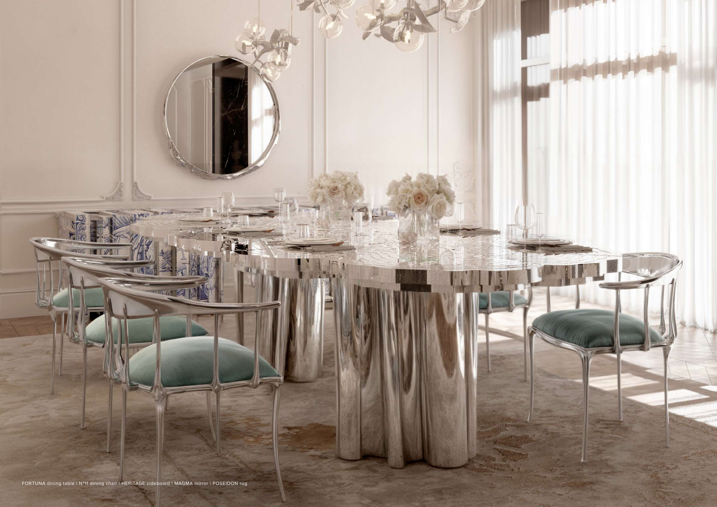 FORTUNA dining table | Nª11 dining chair | HERITAGE sideboard | MAGMA mirror | POSEIDON rug