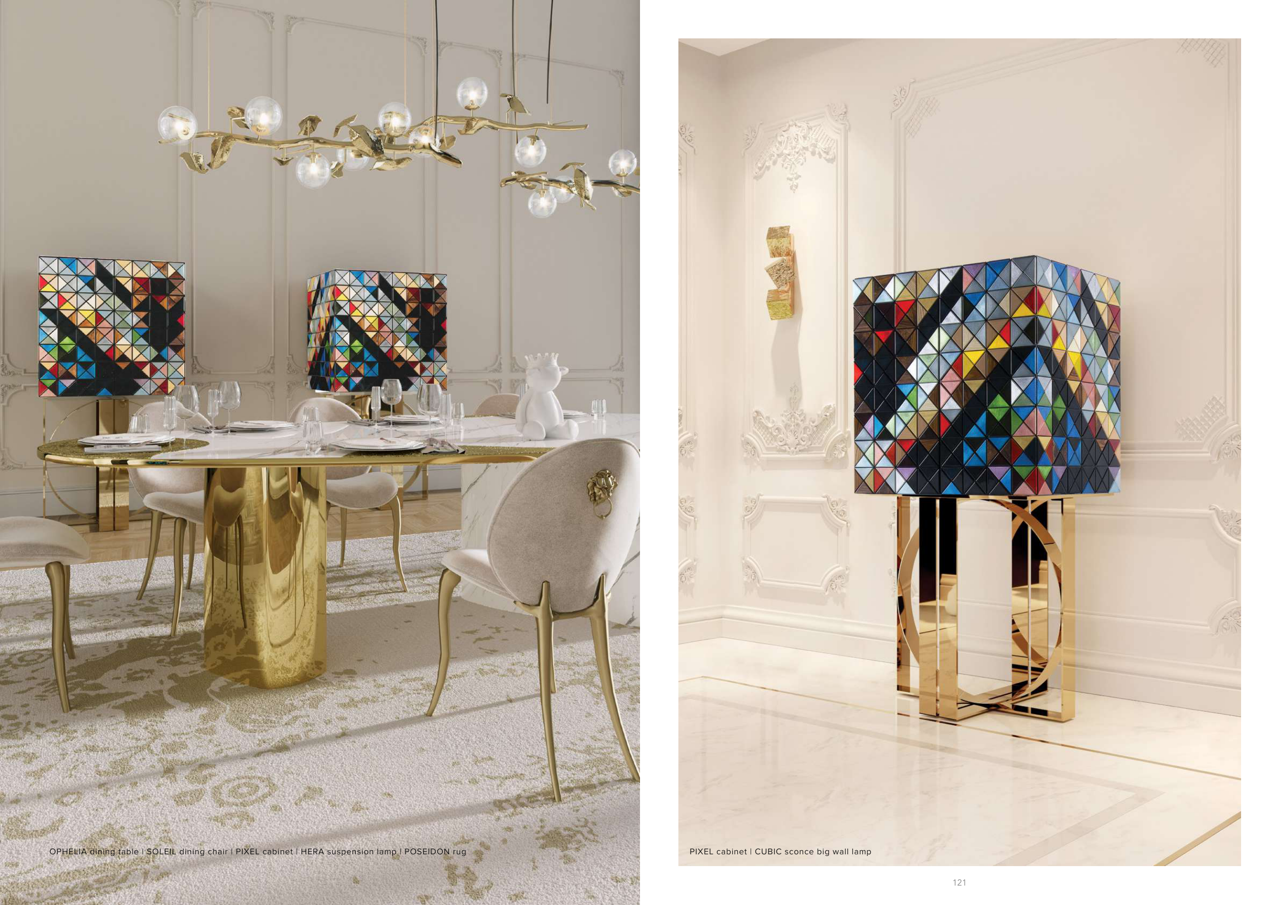 OPHELIA dining table | SOLEIL dining chair | PIXEL cabinet | HERA suspension lamp | POSEIDON rug