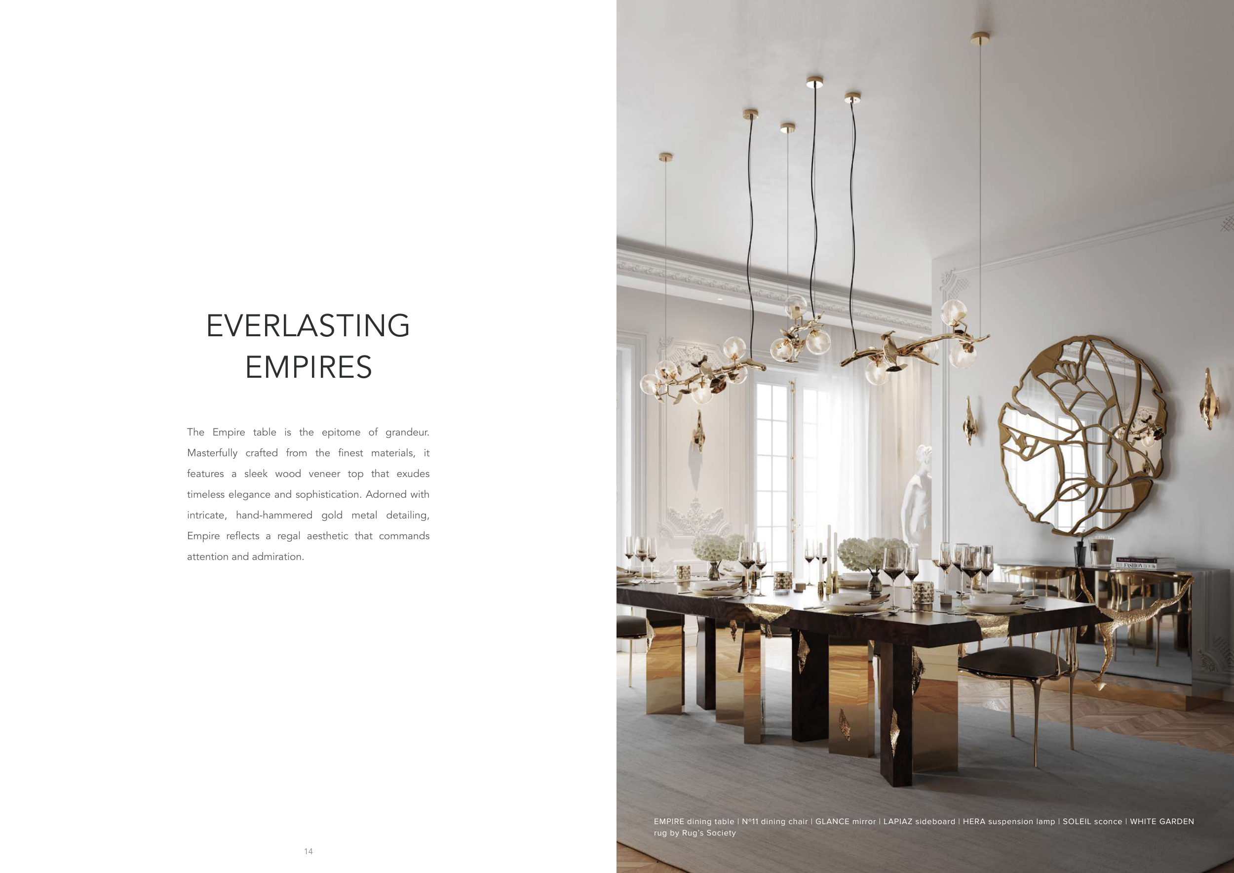 EMPIRE dining table | Nº11 dining chair | GLANCE mirror | LAPIAZ sideboard | HERA suspension lamp | SOLEIL sconce | WHITE GARDEN