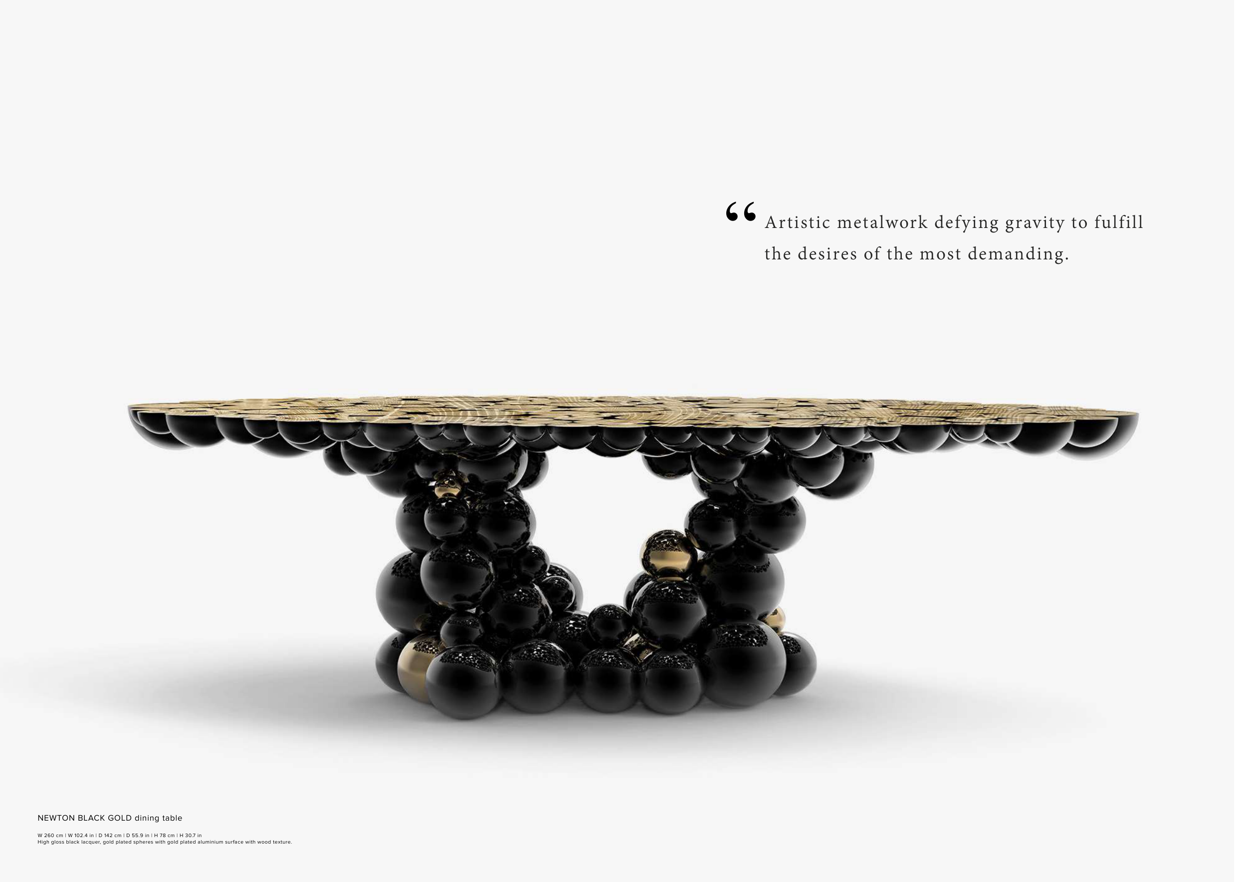 High gloss black lacquer, gold plated spheres with gold plated aluminium surface with wood texture.