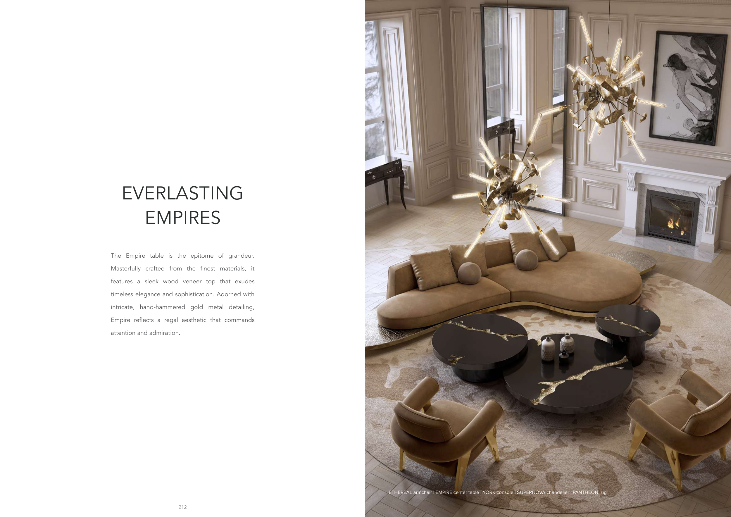 ETHEREAL armchair | EMPIRE center table | YORK console | SUPERNOVA chandelier | PANTHEON rug