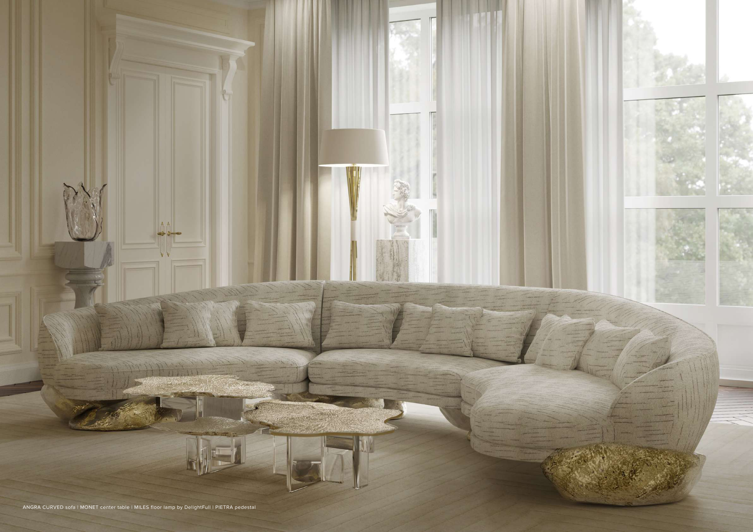 ANGRA CURVED sofa | MONET center table | MILES floor lamp by DelightFull | PIETRA pedestal