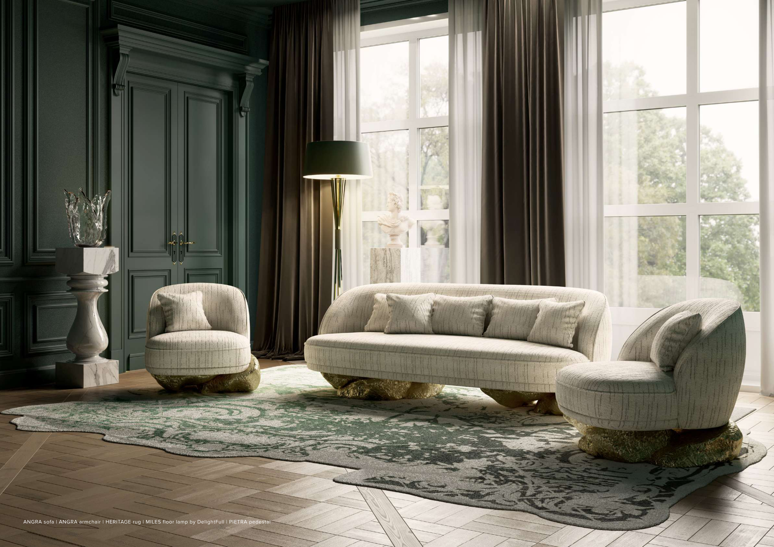ANGRA sofa | ANGRA armchair | HERITAGE rug | MILES floor lamp by DelightFull | PIETRA pedestal