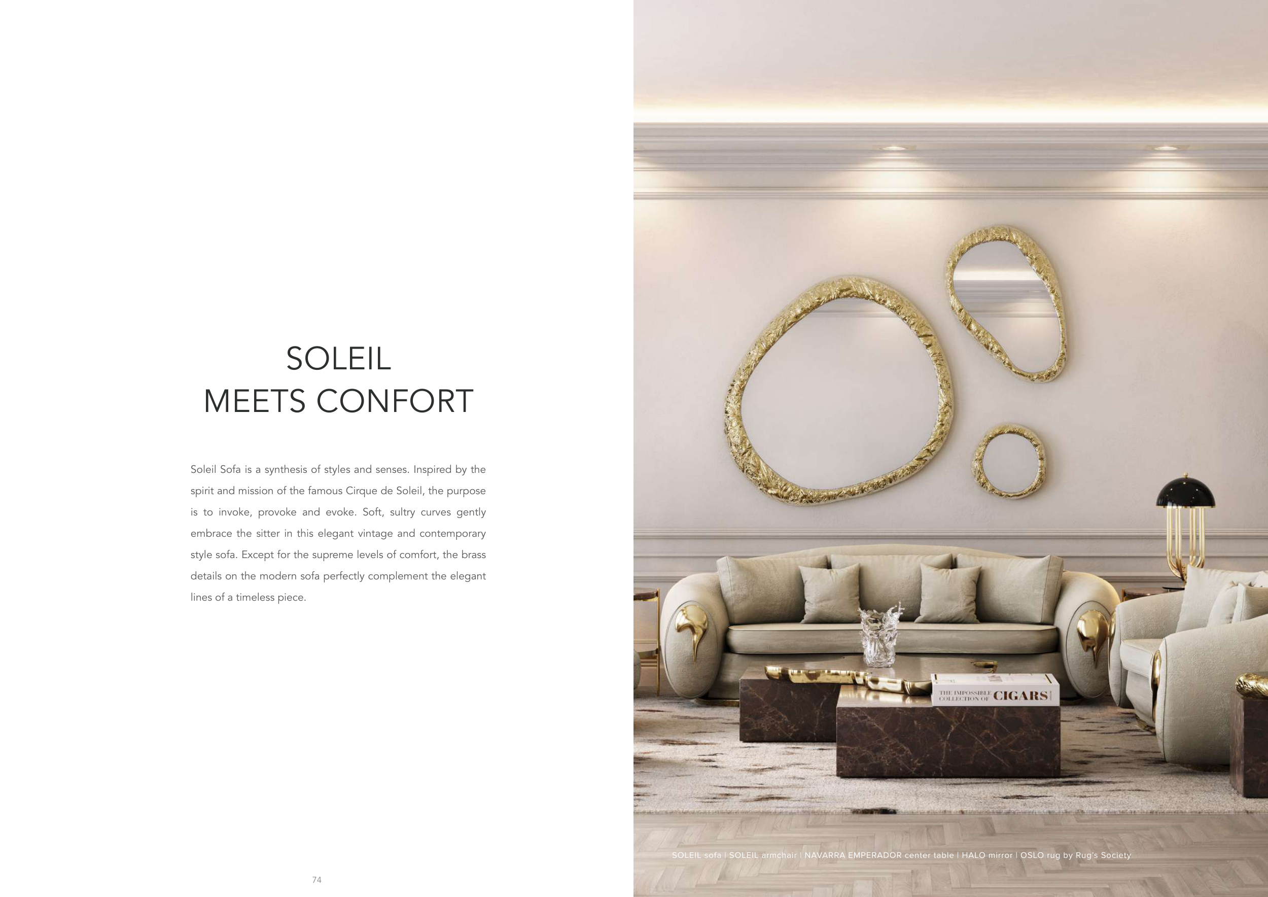 SOLEIL sofa | SOLEIL armchair | NAVARRA EMPERADOR center table | HALO mirror | OSLO rug by Rug’s Society