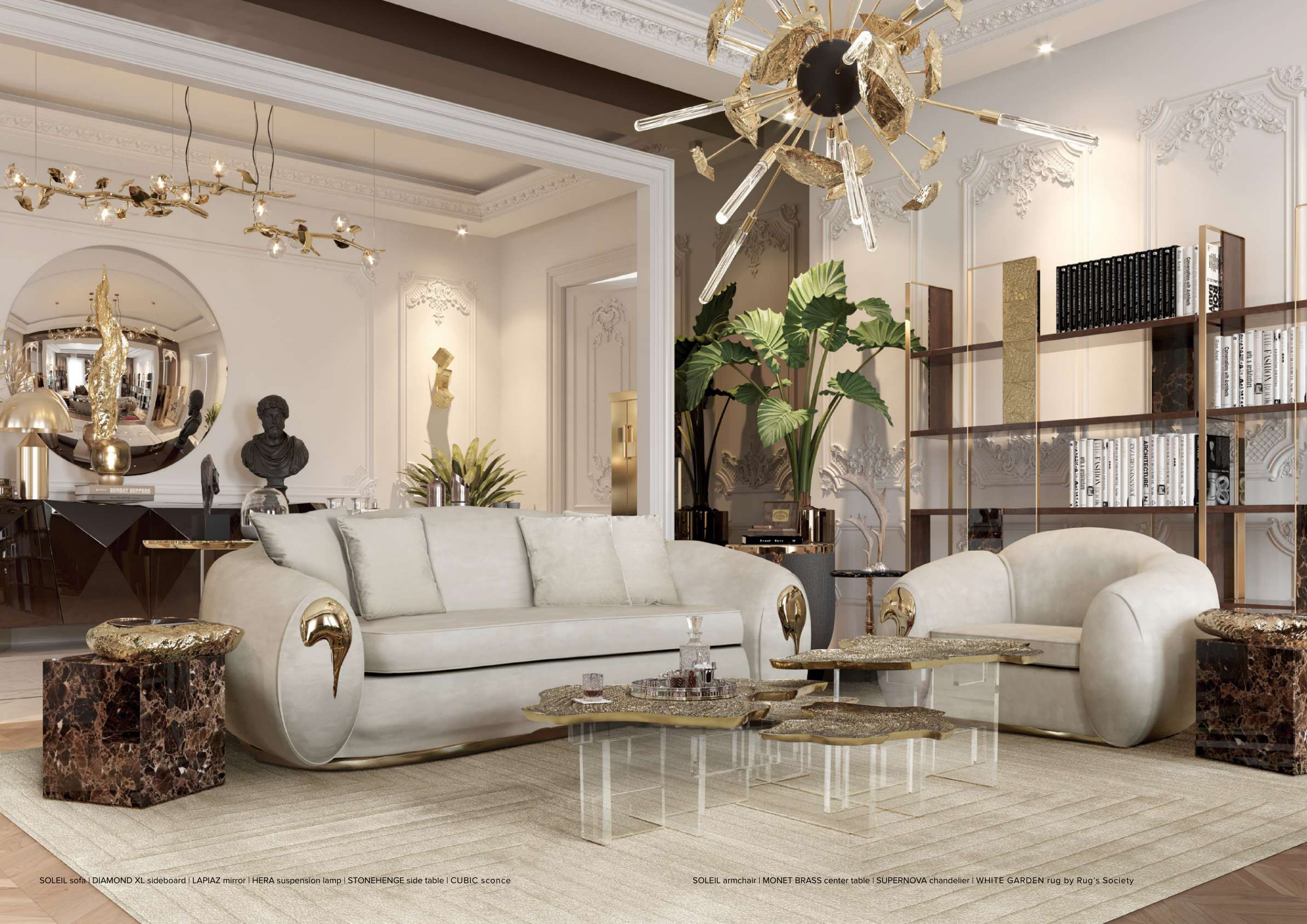 SOLEIL armchair | MONET BRASS center table | SUPERNOVA chandelier | WHITE GARDEN rug by Rug’s Society