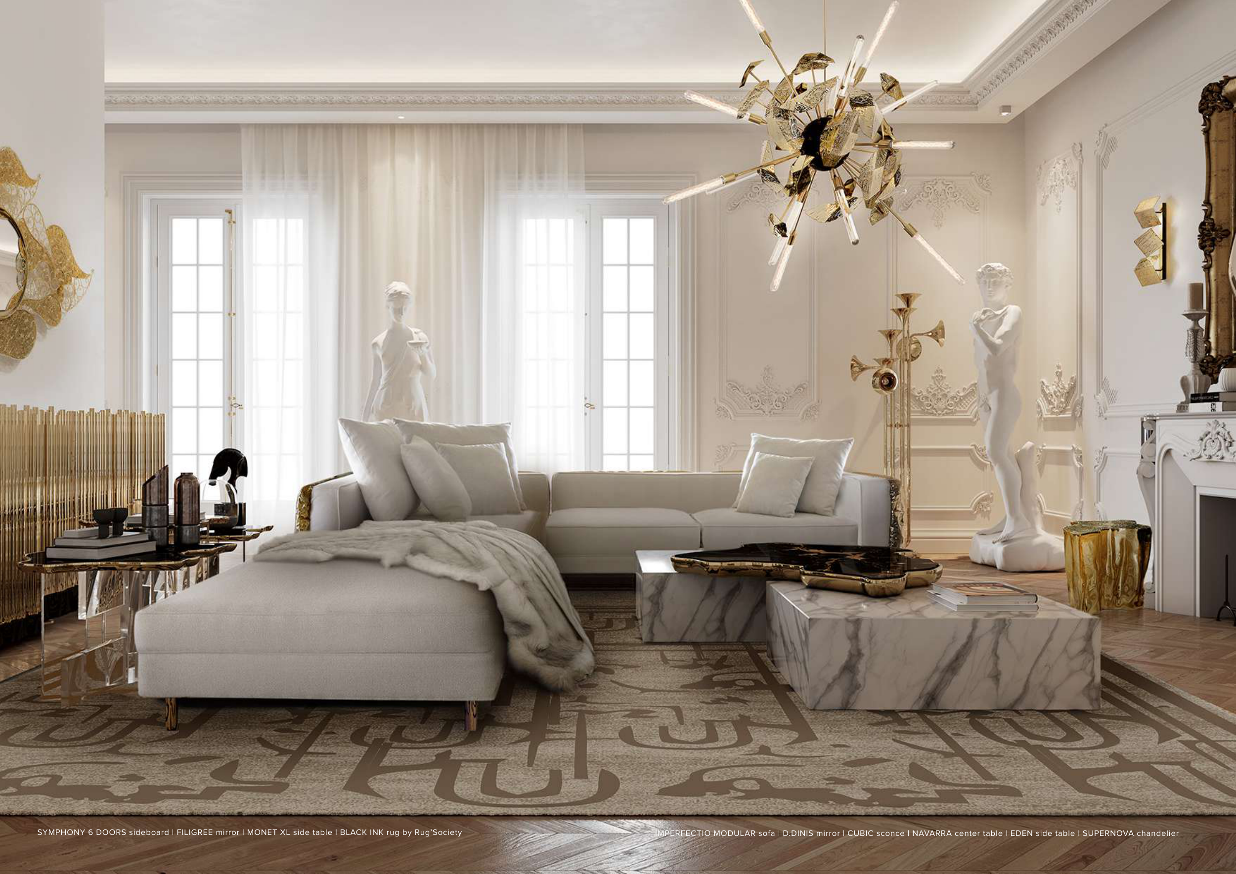 IMPERFECTIO MODULAR sofa | D.DINIS mirror | CUBIC sconce | NAVARRA center table | EDEN side table | SUPERNOVA chandelier