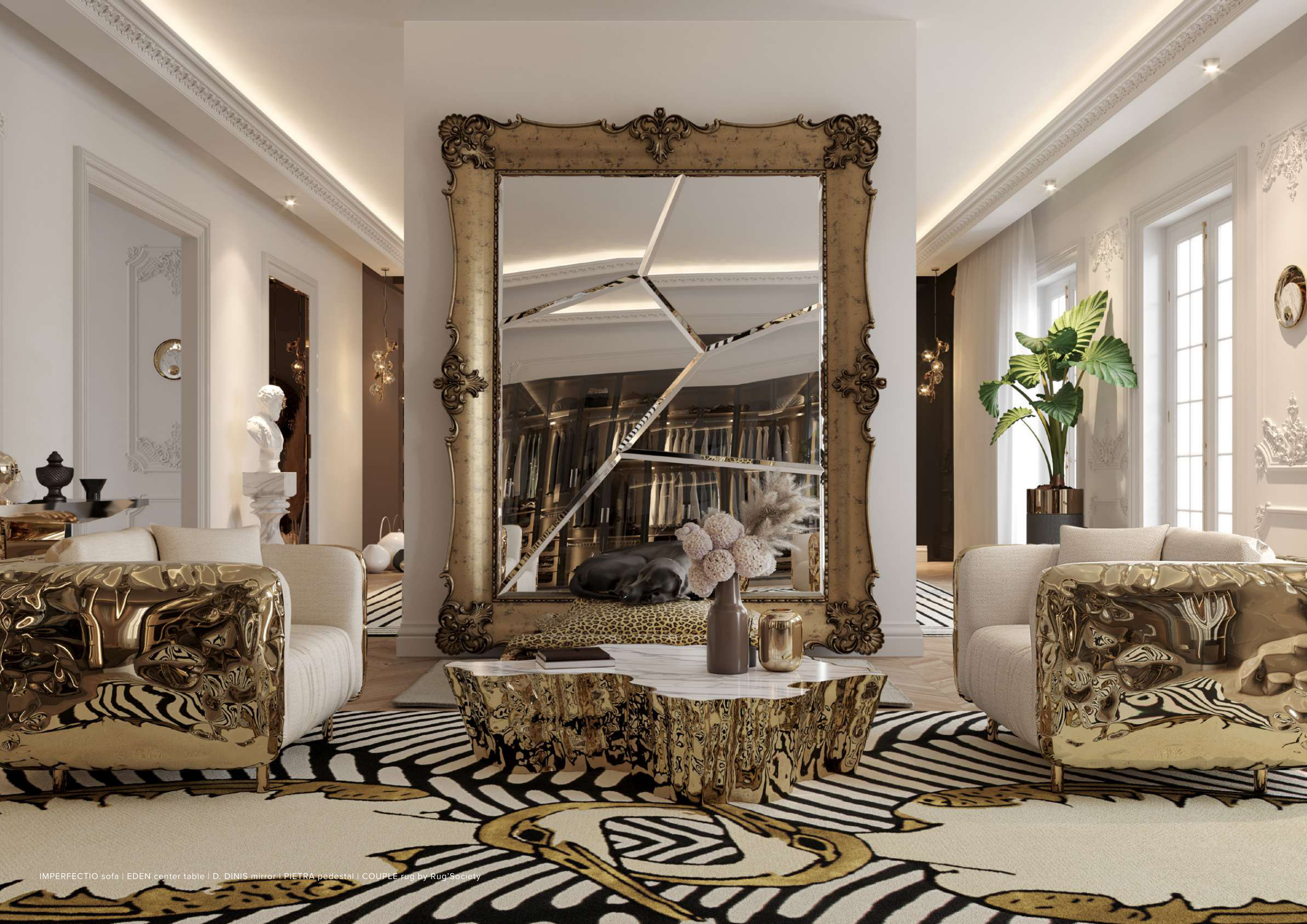 IMPERFECTIO sofa | EDEN center table | D. DINIS mirror | PIETRA pedestal | COUPLE rug by Rug’Society