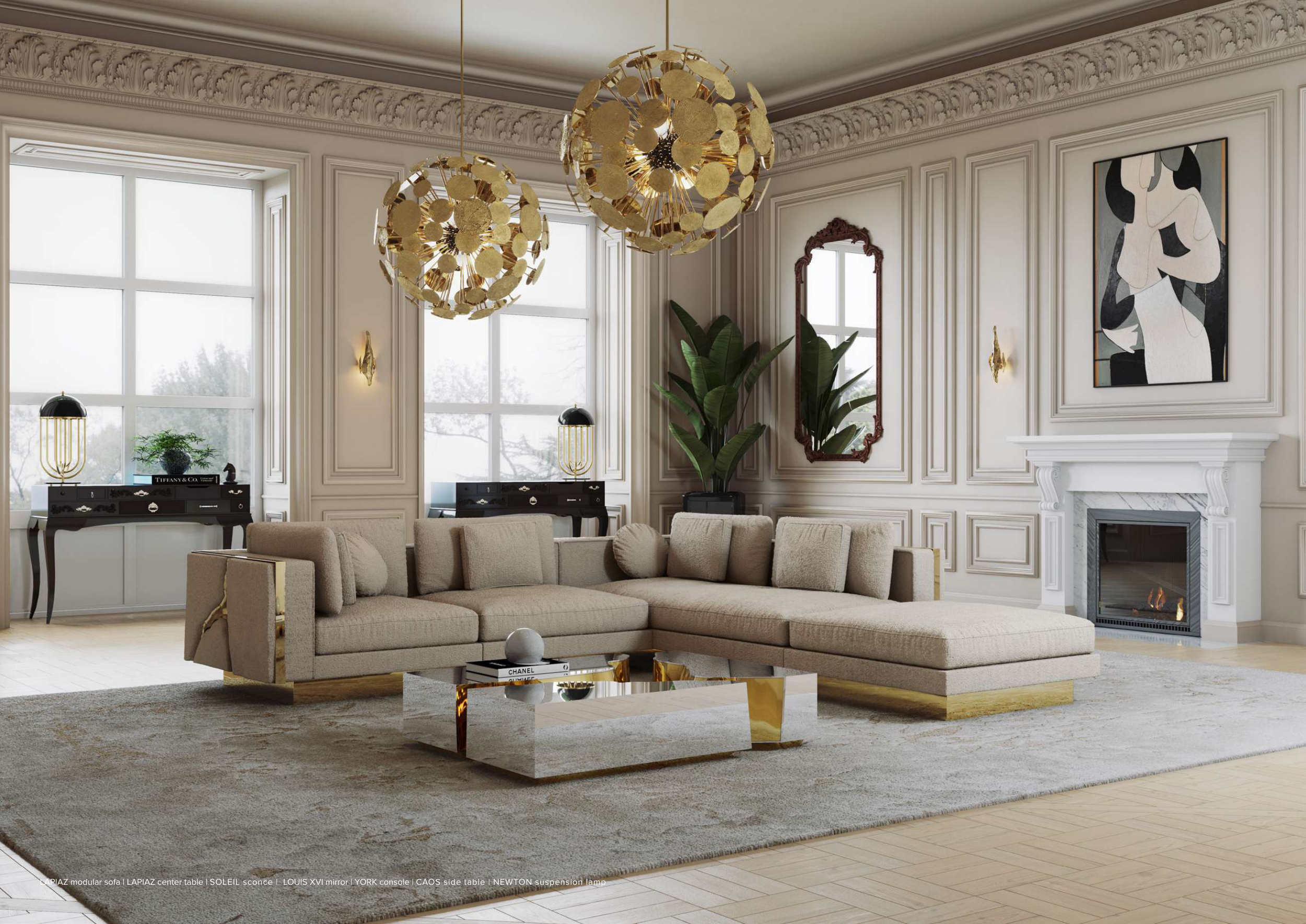 LAPIAZ modular sofa | LAPIAZ center table | SOLEIL sconce | LOUIS XVI mirror | YORK console | CAOS side table | NEWTON suspension lamp