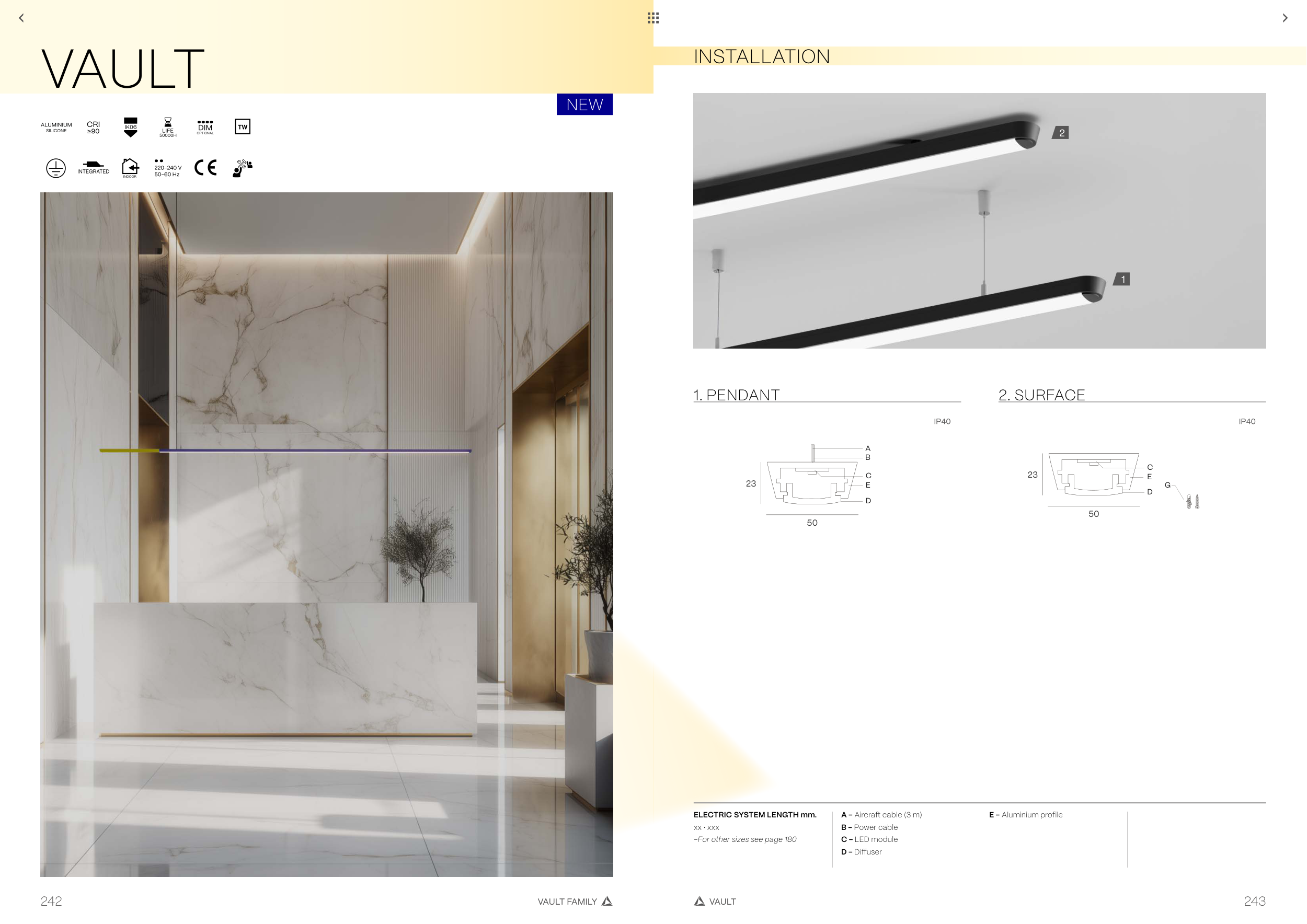 VAULT FAMILY VAULT 243 242 NEW INSTALLATION VAULT 1. PENDANT A B E C D 50 23 G E C D 50 23 2. SURFACE ELECTRIC SYSTEM LENGTH mm. xx · xxx -For other sizes see page 180 A - Aircraft cable (3 m) B - Power cable C - LED module D - Diffuser E - Aluminium profile 2 1
