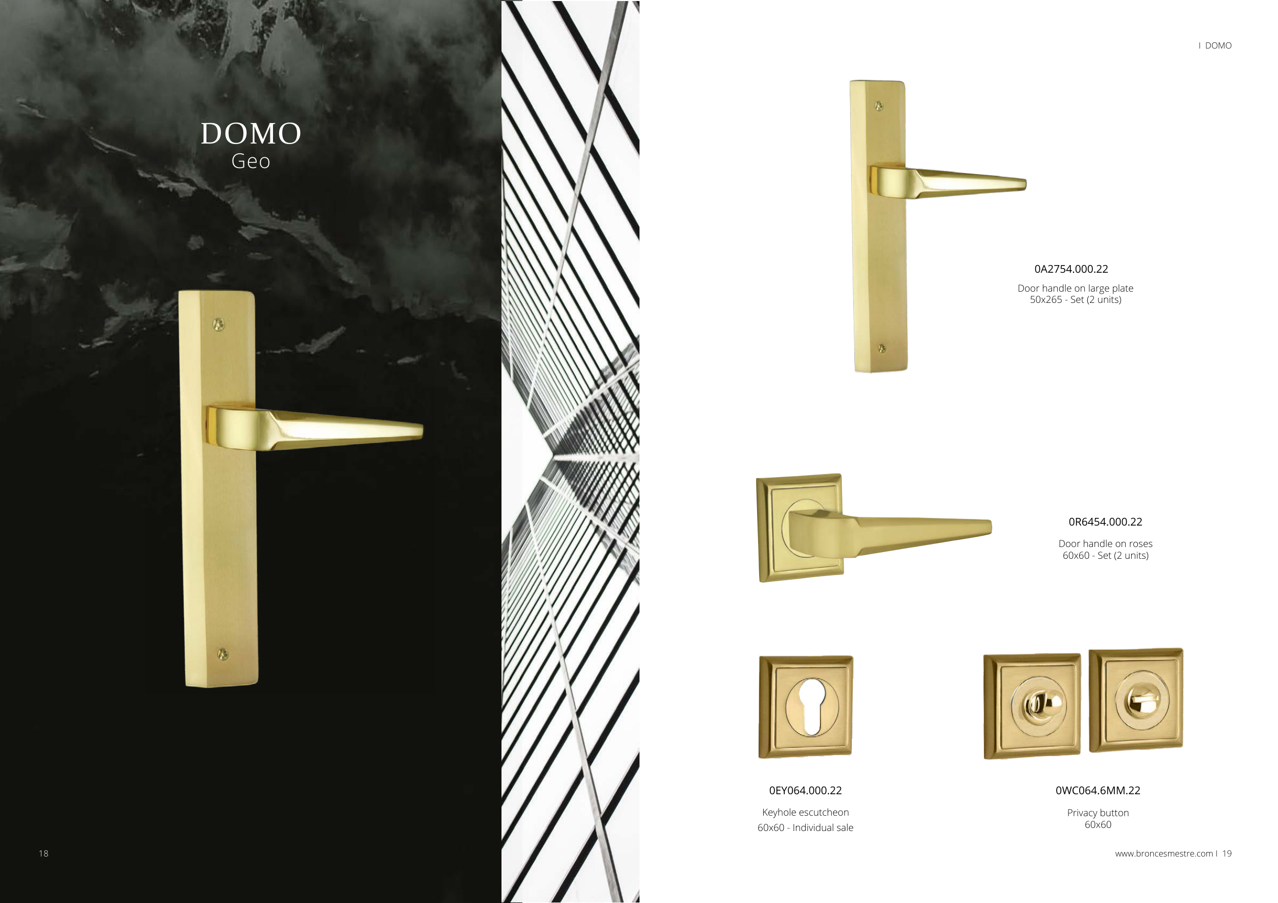 DOMO Geo I DOMO 0A2754.000.22 0R6454.000.22 Door handle on large plate 50x265 - Set (2 units) Door handle on roses 60x60 - Set (2 units) www.broncesmestre.com I 19 18 0EY064.000.22 Keyhole escutcheon 60x60 - Individual sale 0WC064.6MM.22 Privacy button 60x60