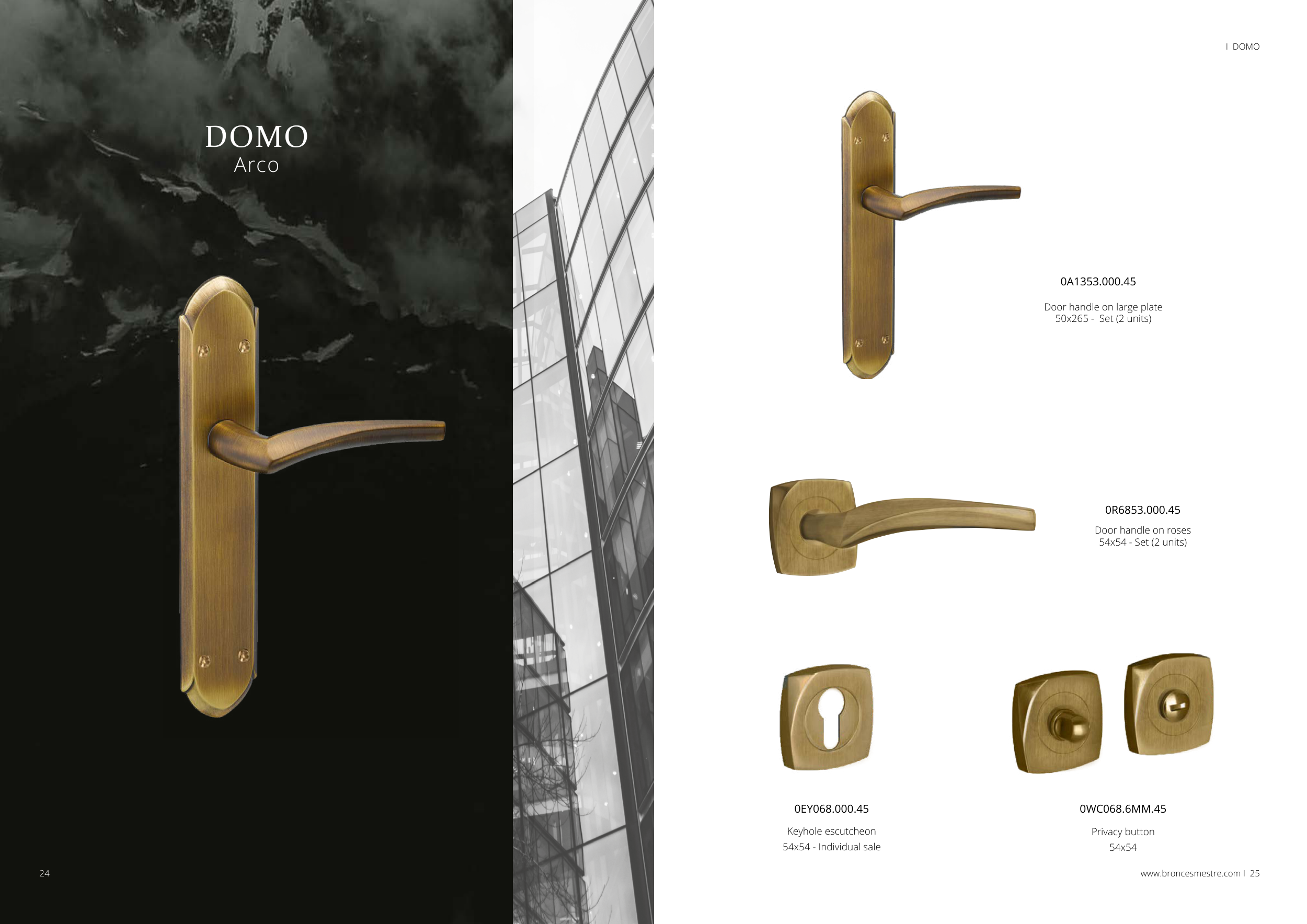 DOMO Arco www.broncesmestre.com I 25 I DOMO 0A1353.000.45 0R6853.000.45 Door handle on large plate 50x265 - Set (2 units) Door handle on roses 54x54 - Set (2 units) 24 0EY068.000.45 Keyhole escutcheon 54x54 - Individual sale 0WC068.6MM.45 Privacy button 54x54