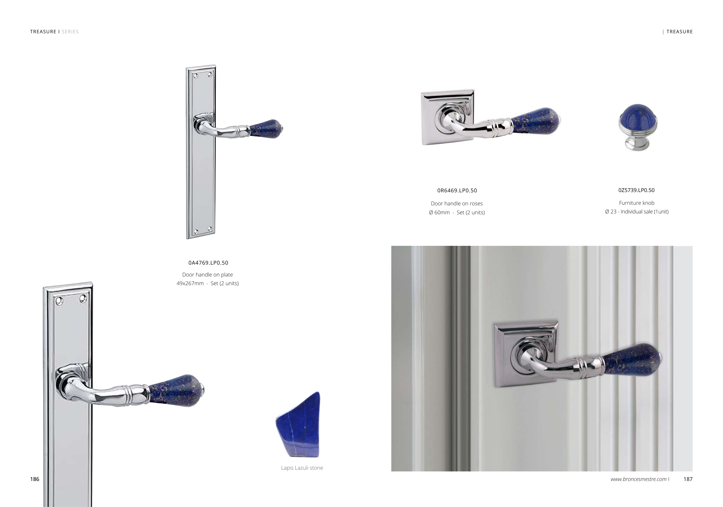www.broncesmestre.com I 187 186 TREASURE I SERIES 0A4769.LP0.50 Door handle on plate 49x267mm - Set (2 units) | TREASURE 0R6469.LP0.50 Door handle on roses Ø 60mm - Set (2 units) 186 0Z5739.LP0.50 Furniture knob Ø 23 - Individual sale (1unit) Lapis Lazuli stone