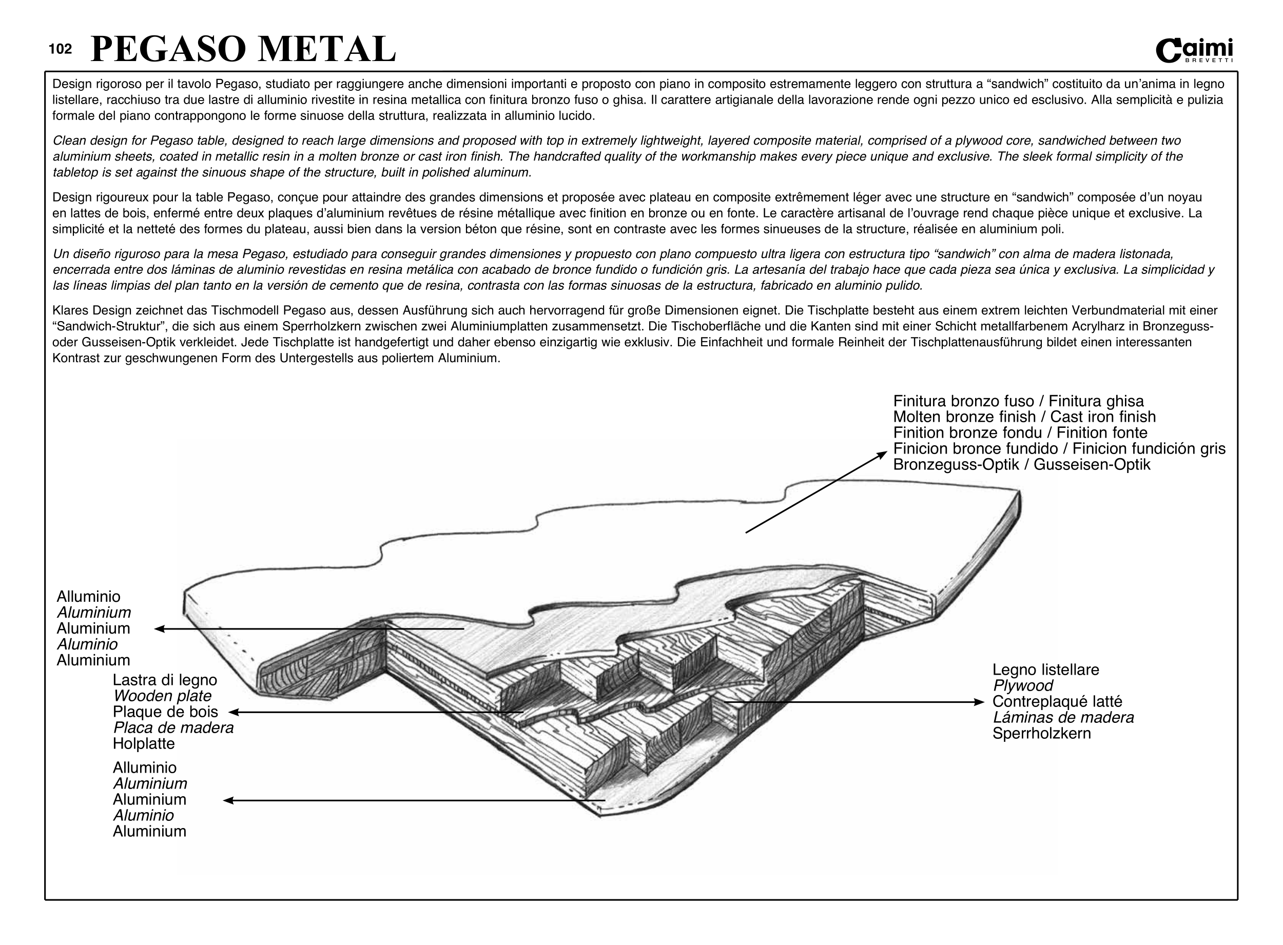 “Sandwich-Struktur”, die sich aus einem Sperrholzkern zwischen zwei Aluminiumplatten zusammensetzt. Die Tischoberfläche und die Kanten sind mit einer Schicht metallfarbenem Acrylharz in Bronzeguss-