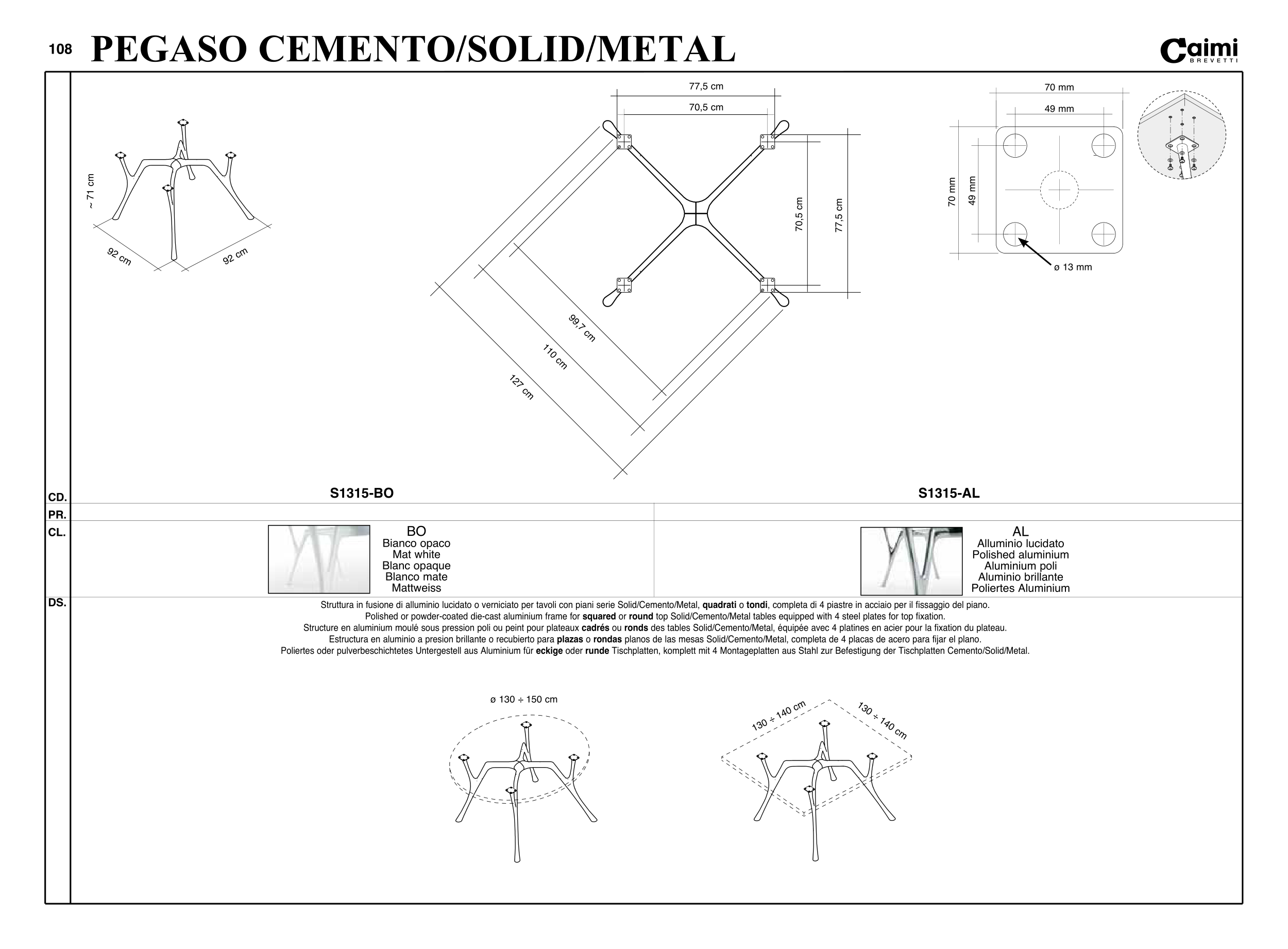 Polished or powder-coated die-cast aluminium frame for squared or round top Solid/Cemento/Metal tables equipped with 4 steel plates for top fixation.