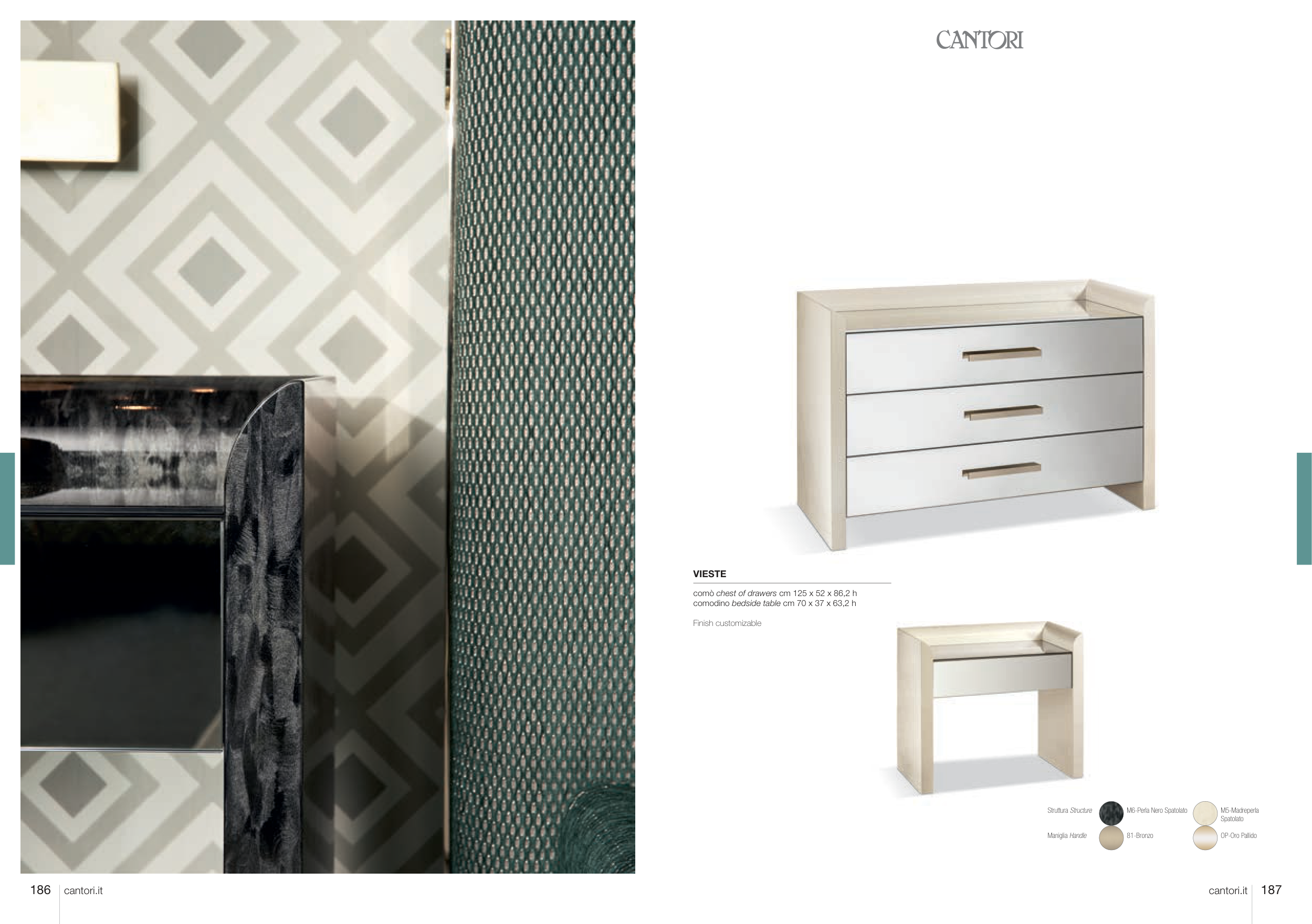 VIESTE comò chest of drawers cm 125 x 52 x 86,2 h comodino bedside table cm 70 x 37 x 63,2 h Finish customizable Struttura Structure Maniglia Handle M5-Madreperla Spatolato OP-Oro Pallido M6-Perla Nero Spatolato 81-Bronzo 186 187 cantori.it cantori.it