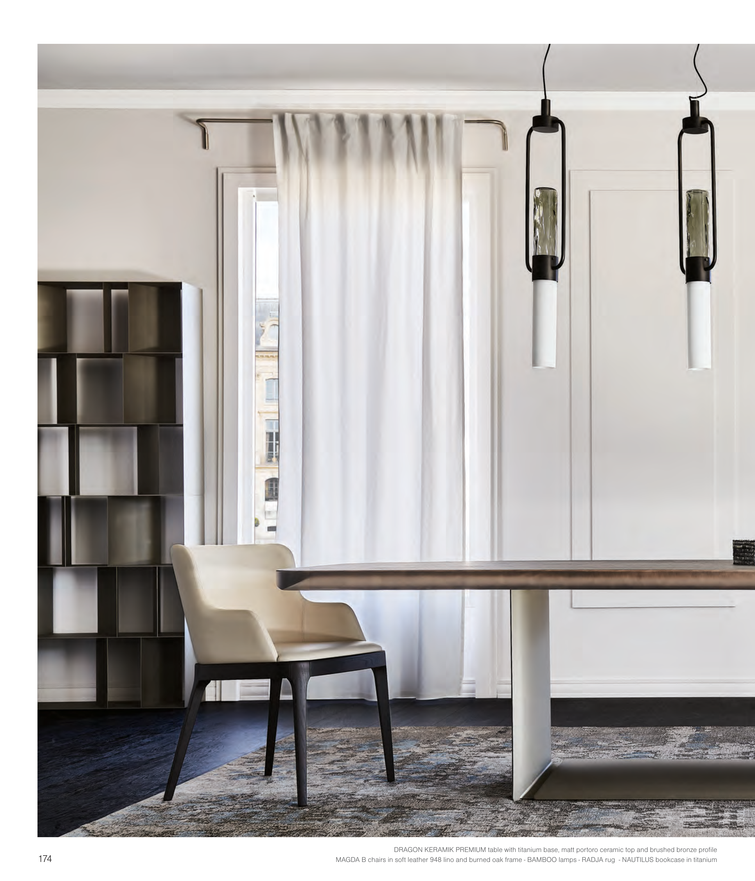 MAGDA B chairs in soft leather 948 lino and burned oak frame - BAMBOO lamps - RADJA rug - NAUTILUS bookcase in titanium