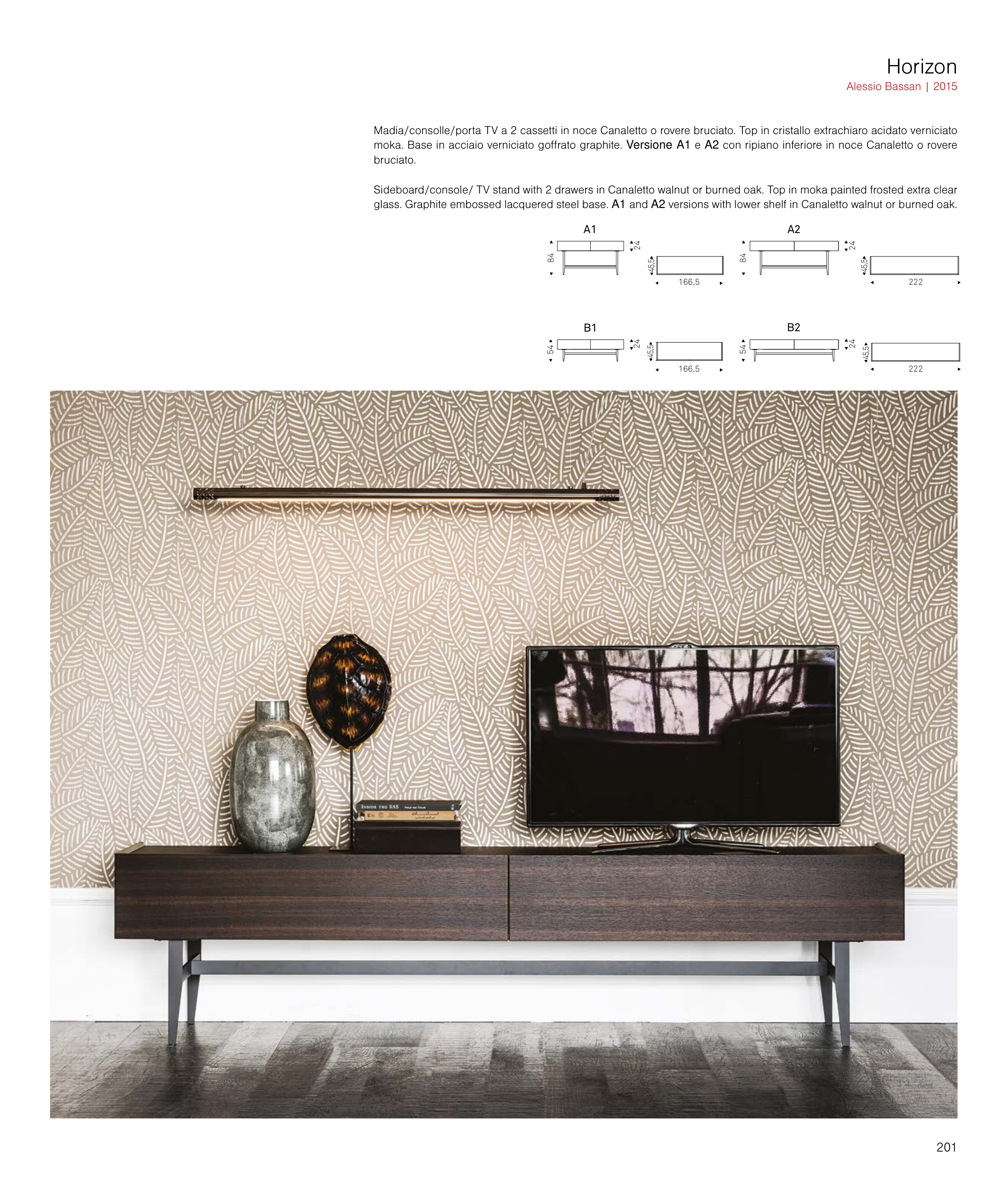 glass. Graphite embossed lacquered steel base. A1 and A2 versions with lower shelf in Canaletto walnut or burned oak.