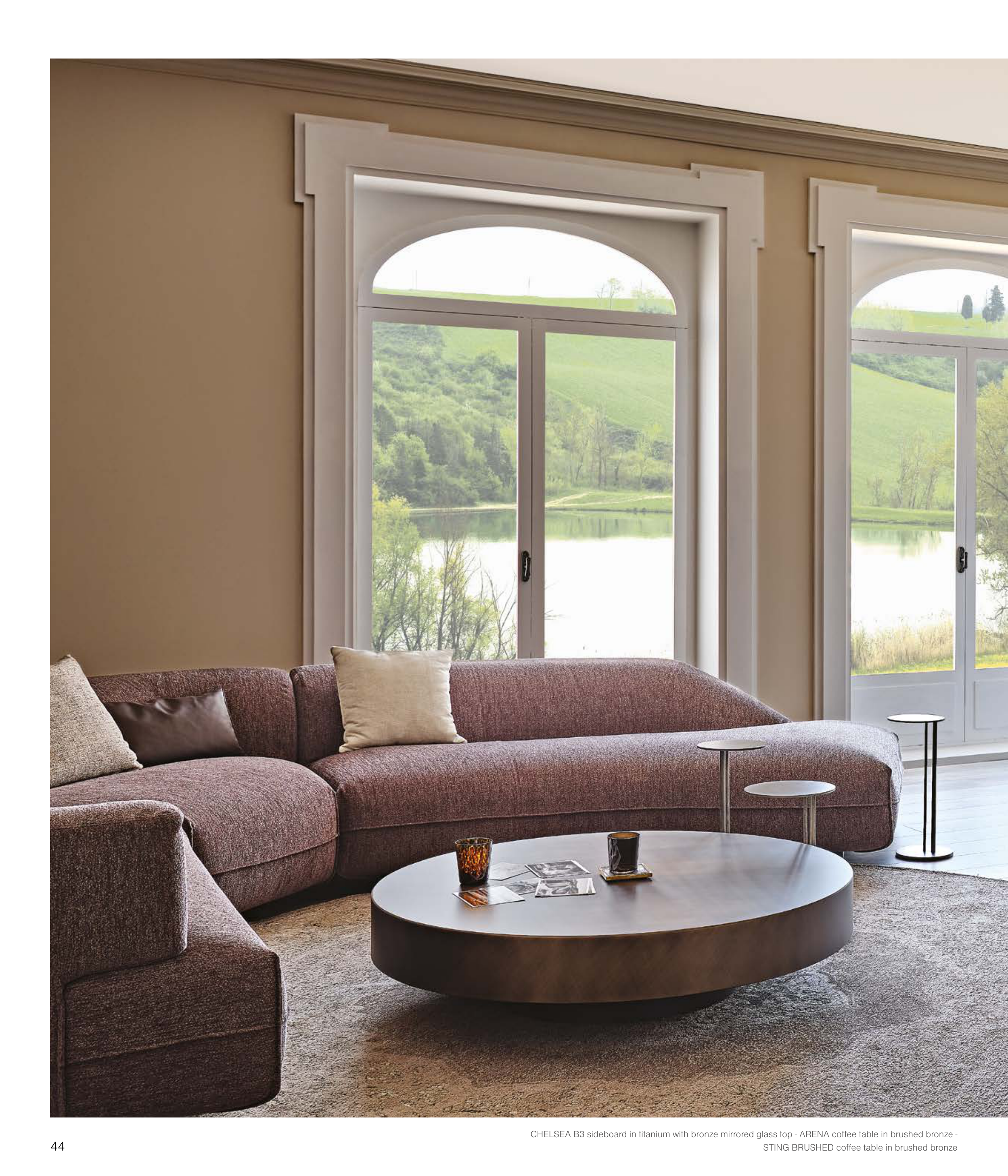 CHELSEA B3 sideboard in titanium with bronze mirrored glass top - ARENA coffee table in brushed bronze -