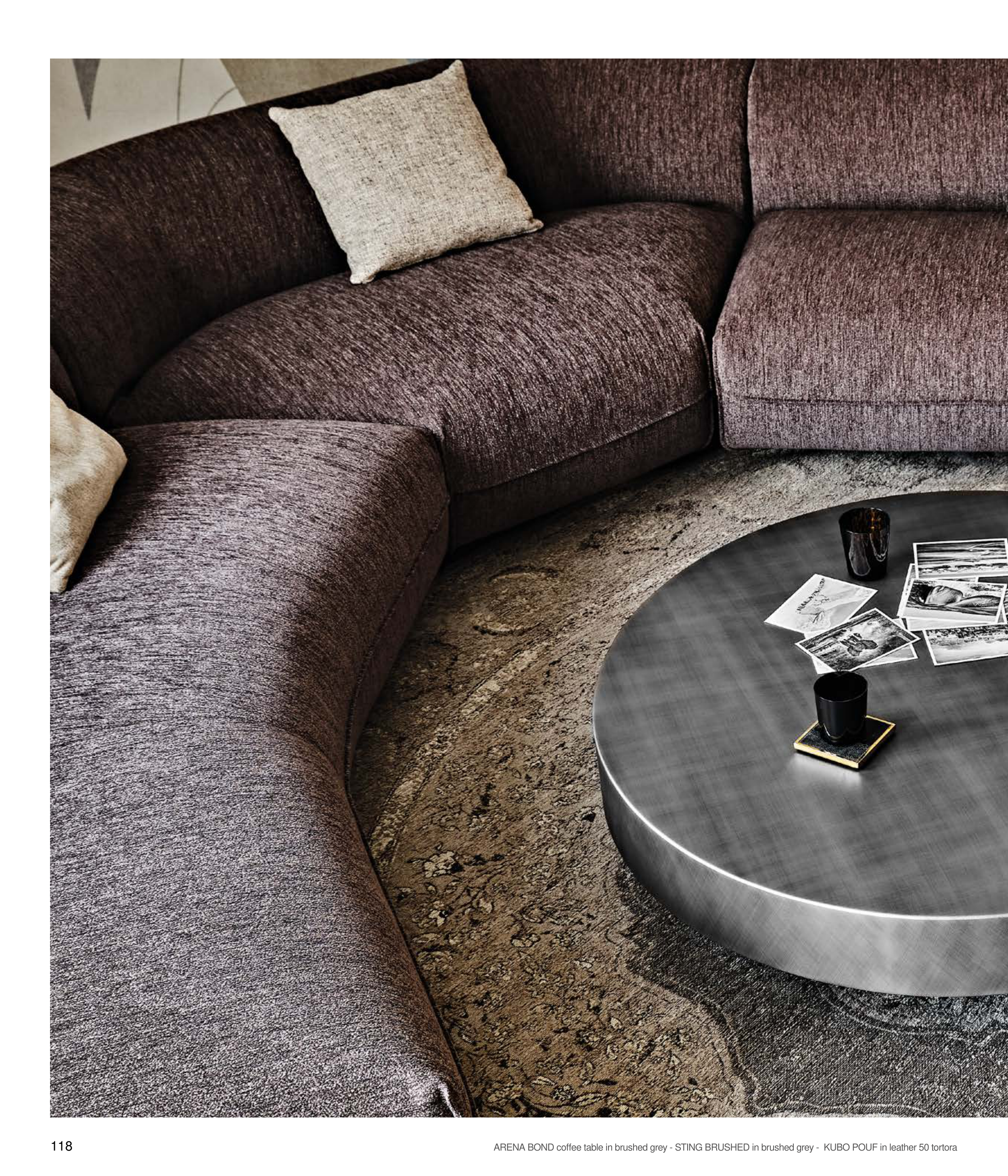 ARENA BOND coffee table in brushed grey - STING BRUSHED in brushed grey - KUBO POUF in leather 50 tortora
