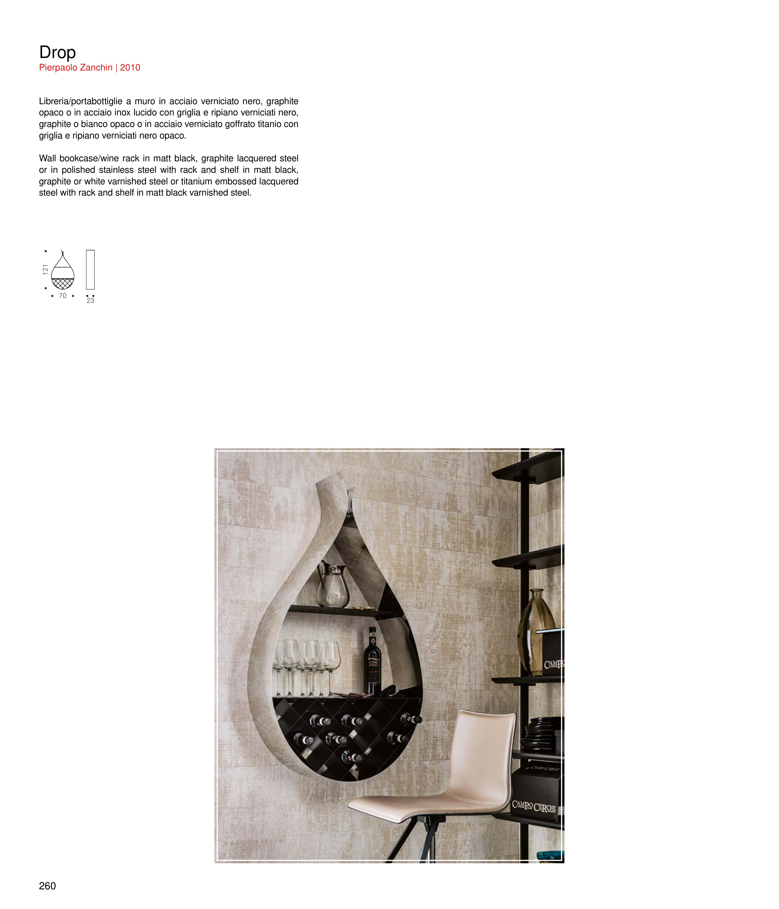 or in polished stainless steel with rack and shelf in matt black,