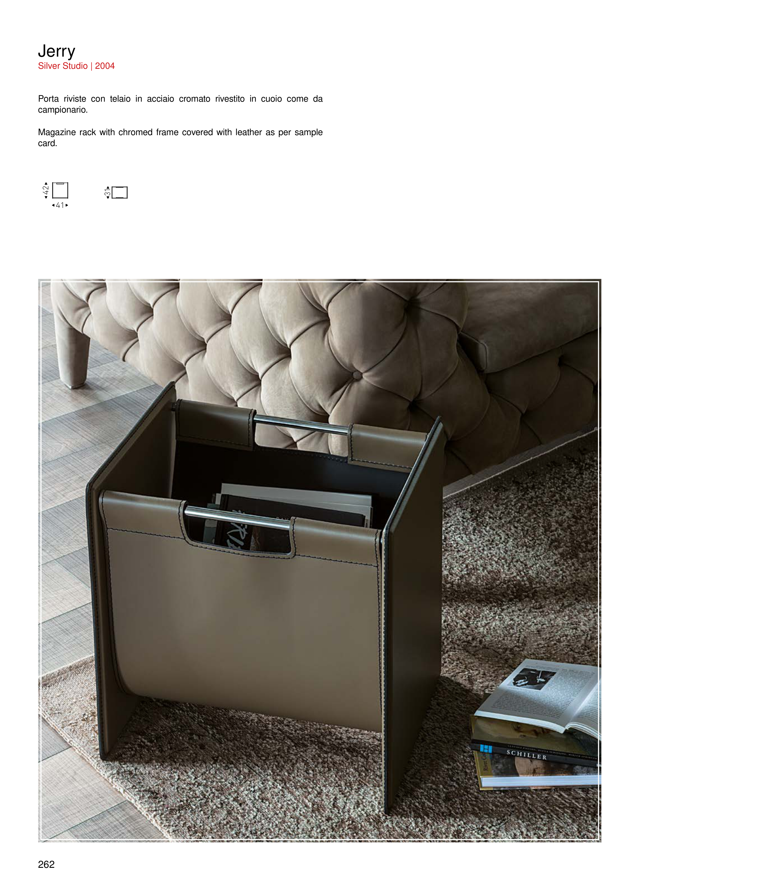 Porta riviste con telaio in acciaio cromato rivestito in cuoio come da